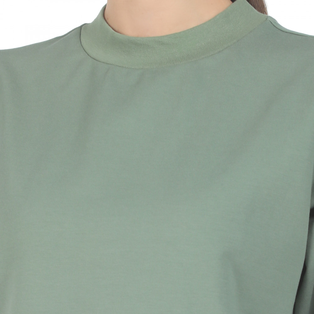 Цвет не соответствует фото, он не такой спокойный серо-зеленый, более яркий, болотно-травяной, что-ли. Закажу такие футболки ещё в других цветах, на зиму под пиджаки и кардиганы будет самое то