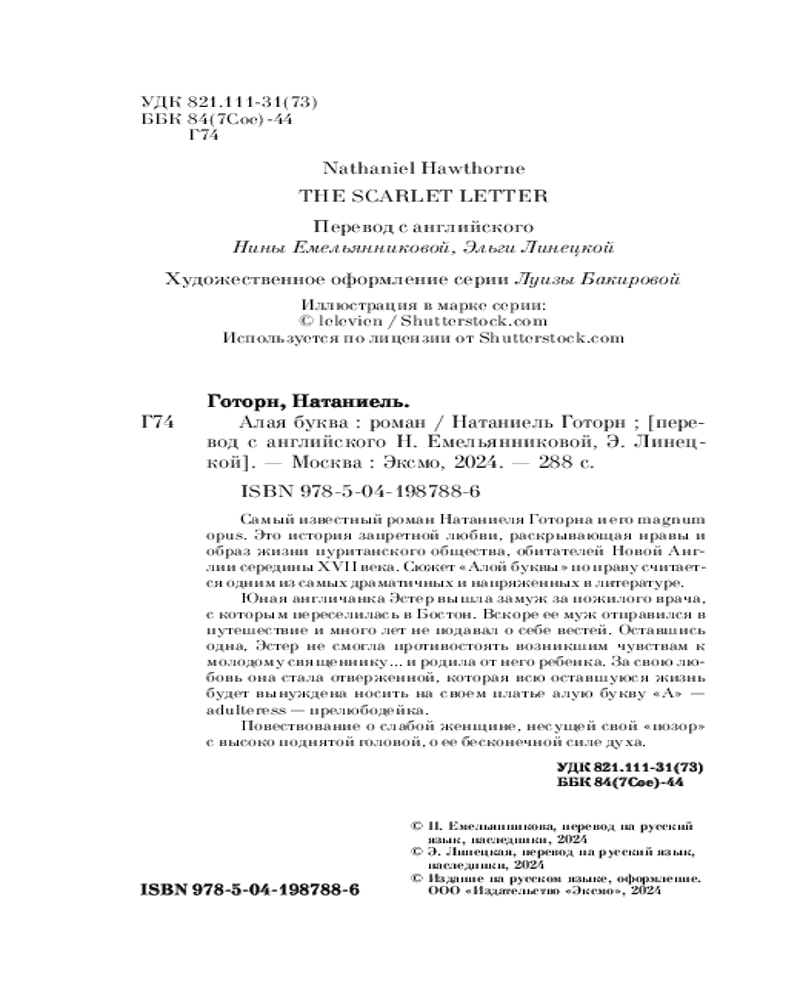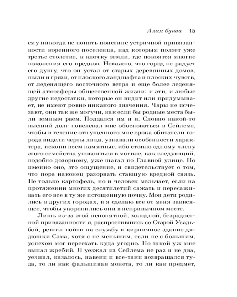 Серия: Белая птица Юная англичанка Эстер вышла замуж за пожилого врача, с которым переселилась в Бостон. Вскоре ее муж отправился в путешествие и много лет не подавал о себе вестей. Оставшись одна, Эстер не смогла противостоять возникшим чувствам к молодому священнику... и родила от него ребенка. За свою любовь она стала отверженной, которая всю оставшуюся жизнь будет вынуждена носить на своем платье алую букву «А» — adulteress — прелюбодейка. Повествование о слабой женщине, несущей свой «позор» с высоко поднятой головой, о ее бесконечной силе духа. |
