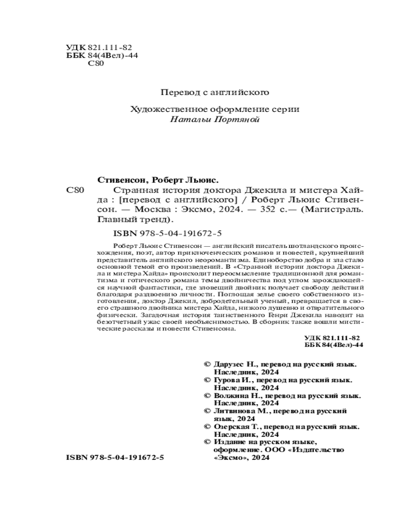 💳 Оплатить за товар можно при получении 🇰🇿 Есть бесплатная доставка по Казахстану от 1 дня 🎁 Копите бонусы с каждой покупки Серия: Магистраль. Главный тренд Роберт Льюис Стивенсон — английский писатель шотландского происхождения, поэт, автор приключенческих романов и повестей, крупнейший представитель английского неоромантизма. Единоборство добра и зла стало основной темой его произведений. В «Странной истории доктора Джекила и мистера Хайда» происходит переосмысление традиционной для романтизма и готического романа темы двойничества под углом зарождающейся научной фантастики, где зловещий двойник получает свободу действий благодаря раздвоению личности. Поглощая зелье своего собственного изготовления, доктор Джекил, добродетельный ученый, превращается в своего страшного двойника мистера Хайда, низкого душевно и отвратительного физически. Загадочная история таинственного Генри Джекила наводит безотчетный ужас своей необъяснимостью. В сборник также вошли мистические рассказы и повести Стивенсона. |