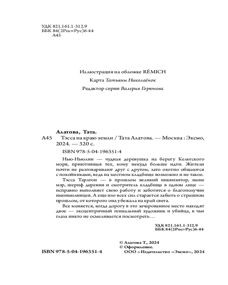 💳 Оплатить за товар можно при получении 🇰🇿 Есть бесплатная доставка по Казахстану от 1 дня 🎁 Копите бонусы с каждой покупки Серия: Дом на краю земли. Уютный мир Таты Алатовой (обложка с клапанами) «Тэсса на краю земли» — первая книга трилогии про Нью-Ньюлин и его обитателей. Это уютная, обволакивающая история, написанная в жанре мистического реализма. По определению читателей, мир Нью-Ньюлина — что-то вроде Муми-далена 18+. Все персонажи — люди с необычными способностями и с какой-то точки зрения настоящие монстры, которым нет места в мире людей. Но отверженные большим миром, они находят приют на самом краю земли, в никому не известной деревушке, и ведут здесь тихую, вполне обычную (по местным меркам) жизнь. Читателю эти «чудовища» предстают с совсем другой стороны — это добрые, трогательные люди, которые наконец-то нашли свой дом и могут быть самими собой. |