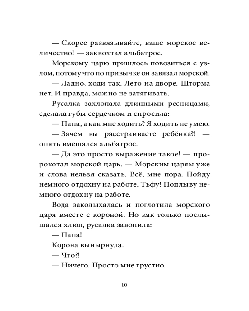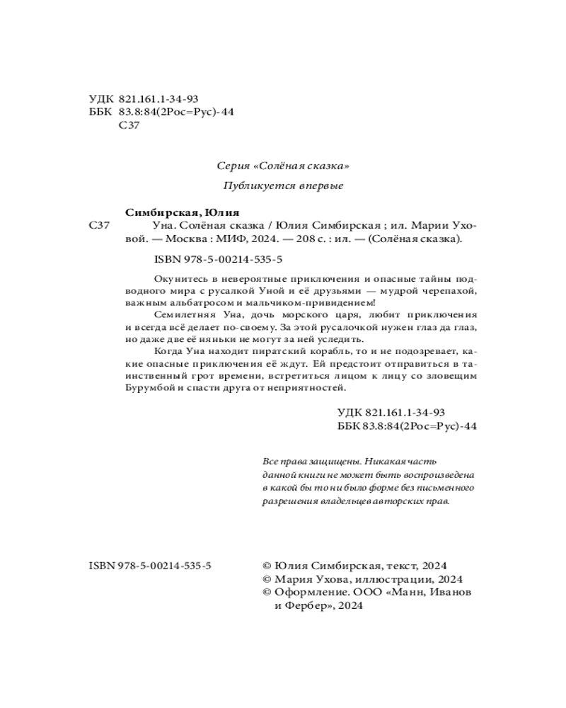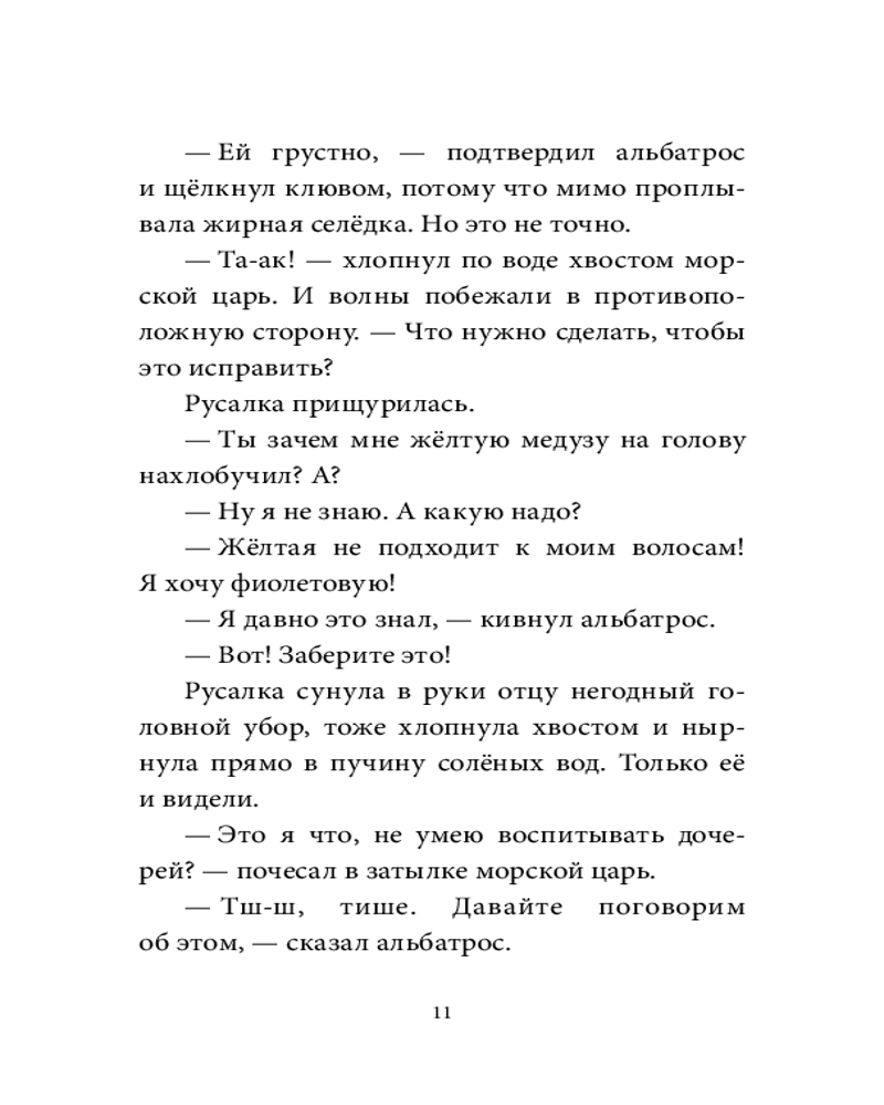 💳 Оплатить за товар можно при получении 🇰🇿 Есть бесплатная доставка по Казахстану от 1 дня 🎁 Копите бонусы с каждой покупки Серия: Солёная сказка Уне семь лет, и она единственная русалка в океане. За ней нужен глаз да глаз, поэтому у неё сразу две няньки — морская черепаха и старый альбатрос. Они даже не могли предположить, что Уна повадится плавать на старый пиратский корабль и подружится там с привидением. На затонувшем корабле поселился ужасный Барабумба, который крадёт самое ценное — радость, дружбу, счастье... Но кто такой Барабумба по сравнению с самой шаловливой русалкой океана? |