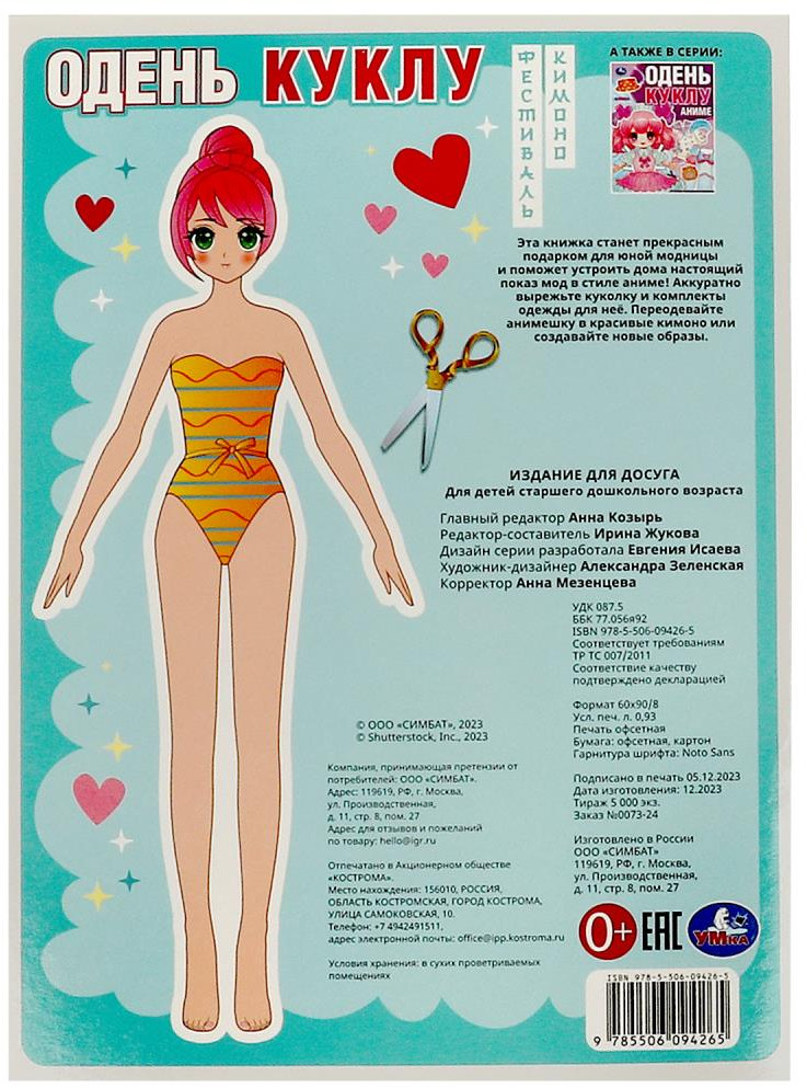 💳 Оплатить за товар можно при получении 🇰🇿 Есть бесплатная доставка по Казахстану от 1 дня 🎁 Копите бонусы с каждой покупки Серия: Одень куклу Активити «Фестиваль кимоно» из серии «Одень куклу» ТМ «УМка» – настоящий подарок для маленькой модницы. Юный дизайнер с удовольствием будет вырезать одежду для очаровательной аниме-куколки и подбирать для неё разнообразные традиционный японские наряды, а потом играть с ней, устраивая настоящие показы мод. Девочка может не только воспользоваться подобранными в данном альбоме комплектами одежды, но и придумать и нарисовать свои варианты, проявив фантазию и творчество. |