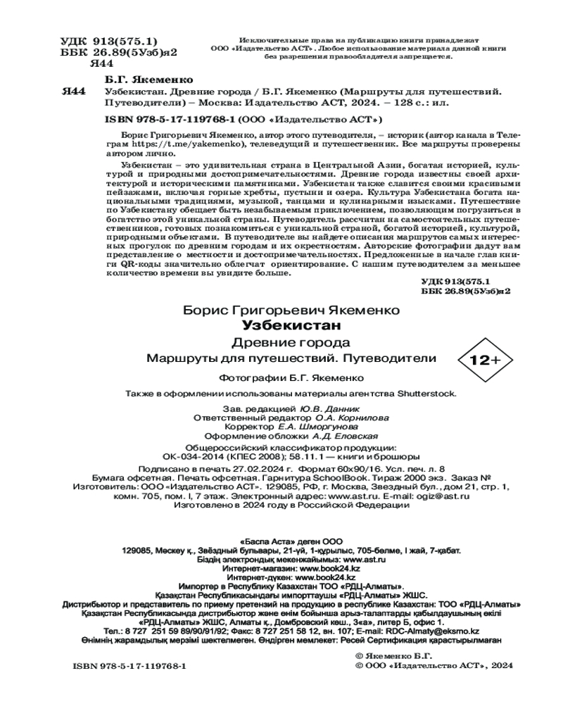 💳 Оплатить за товар можно при получении 🇰🇿 Есть бесплатная доставка по Казахстану от 1 дня 🎁 Копите бонусы с каждой покупки Серия: Маршруты для путешествий. Путеводители Борис Григорьевич Якеменко, автор этого путеводителя, — историк (автор канала в Телеграм https://t.me/yakemenko), телеведущий и путешественник. Все маршруты проверены автором лично. Путеводитель рассчитан на самостоятельных путешественников, готовых познакомиться с уникальной страной, богатой историей, культурой, природными объектами. В путеводителе вы найдете описания маршрутов самых интересных прогулок по древним городам и их окрестностям. Авторские фотографии дадут вам представление о местности и достопримечательностях. Предложенные в начале глав книги QR-коды значительно облегчат ориентирование. С нашим путеводителем за меньшее количество времени вы увидите больше. |