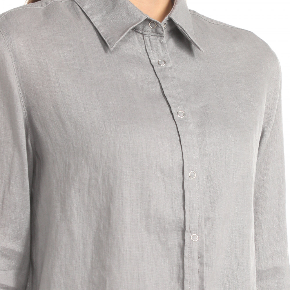Хорошая приятная к телу рубашка, лен хорошего качества, нежный цвет (голубой), брала на размер больше, после стирки сел немного, как раз как надо, надеюсь, что больше не сядет... Удобно как второй слой на выпуск с топом или футболкой.. Единственное, мне не очень понравились кнопки, вроде не портят в целом рубашку.