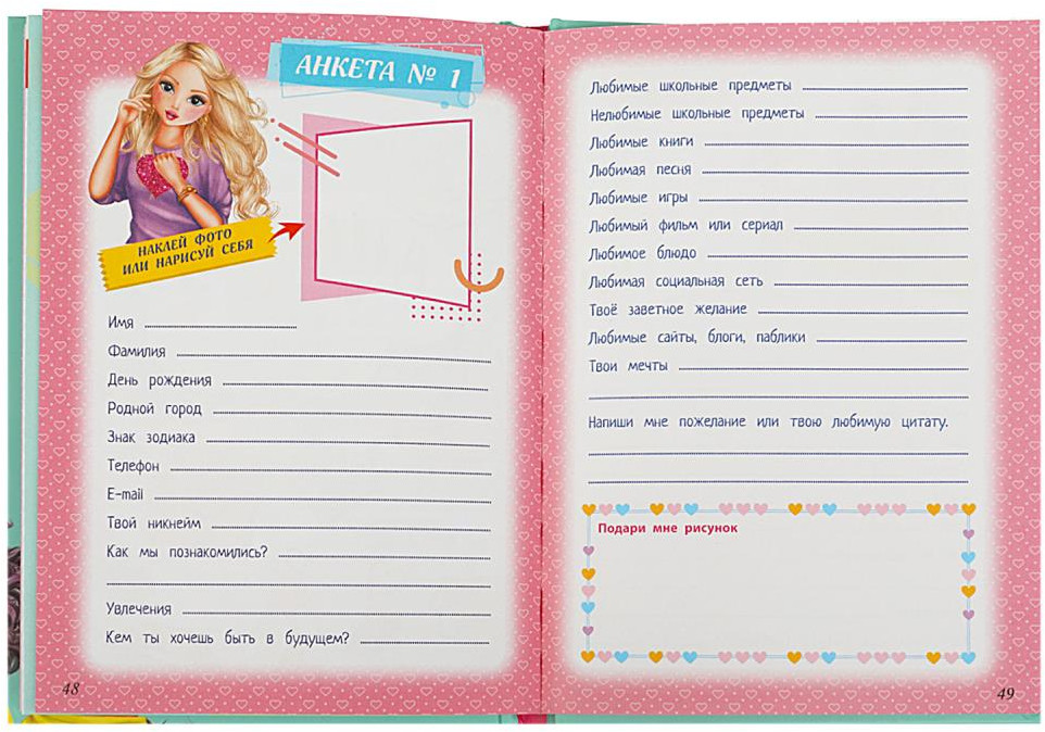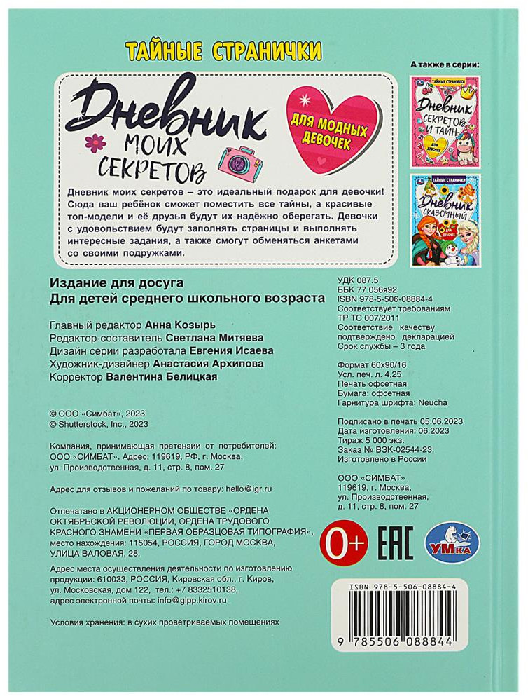 Этот красочный дневник обязательно понравится девочке, которая непременно захочет поделиться с ним своими тайнами и мечтами, а очаровательные персонажи их надёжно сберегут. Она с удовольствием будет заполнять страницы, а также сможет обменяться анкетами со своими подружками. Благодаря удобному формату, дневник можно даже брать с собой в путешествия. Издание «Дневник моих секретов» — отличный подарок для модных девочек.