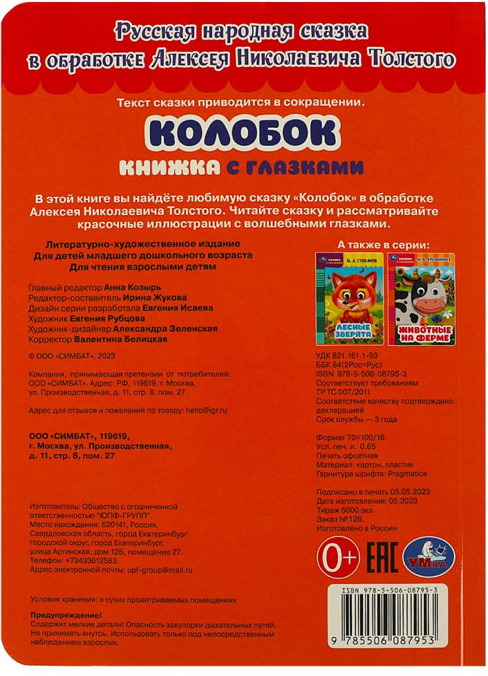 💳 Оплатить за товар можно при получении 🇰🇿 Есть бесплатная доставка по Казахстану 🎁 Копите бонусы с каждой покупки Серия: Книжка с глазками Книжка с глазками «Колобок» ТМ «УМка» непременно понравится маленькому любознайке. На страницах этой яркой книги малыша ждёт встреча с любимыми сказочными героями. Увлекательная история сопровождается большими красочными картинками с подвижными глазками, благодаря которым персонажи сказки выглядят совсем как живые. Компактный размер книги позволяет взять её с собой в путешествие. |