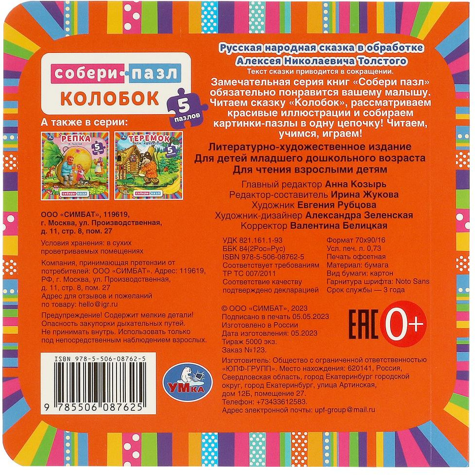 Книга с пазлами «Колобок» из серии «Собери пазл» ТМ «УМка» станет прекрасным подарком для ребёнка. Данная книга выполняет сразу 2 функции: это и книга для чтения, и игра в пазлы. На каждом развороте малыша ждёт интересное повествование, а также яркий пазл с изображением того или иного сказочного персонажа. Все пазлы можно собрать в одну цепочку. Книжка изготовлена из плотного картона, поэтому мамы могут не опасаться, что ребёнок порвёт странички. Благодаря удобному формату книгу можно взять с собой в дорогу. Рекомендовано детям младшего дошкольного возраста.