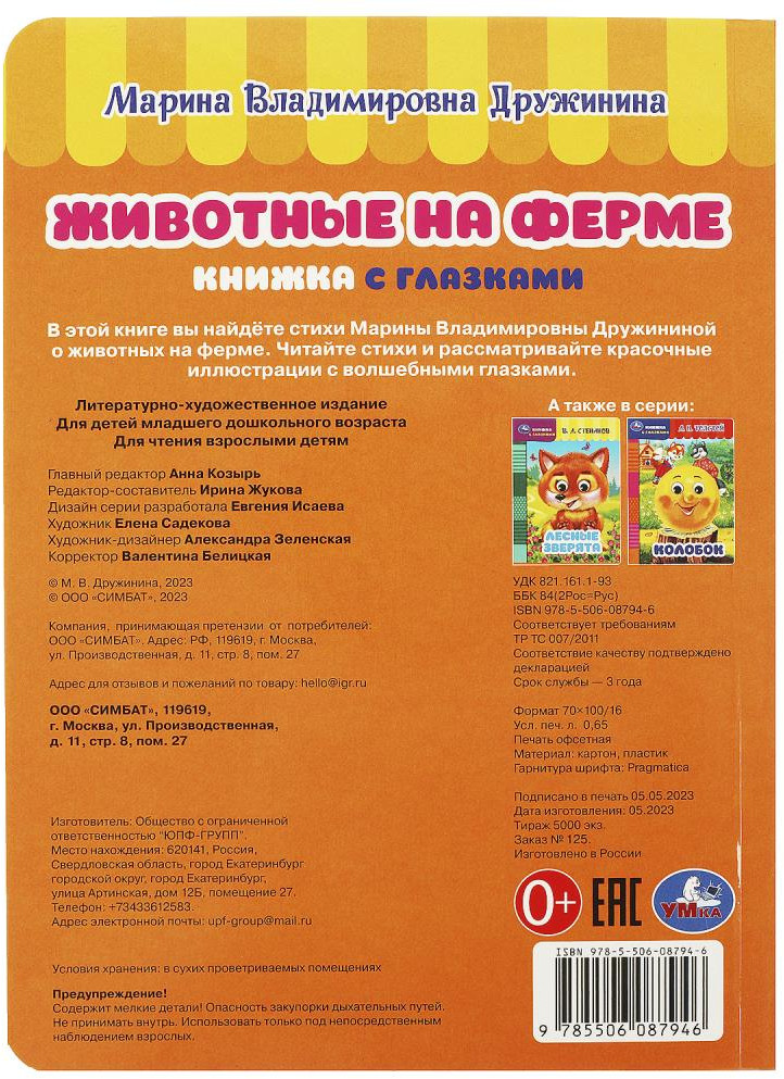 💳 Оплатить за товар можно при получении 🇰🇿 Есть бесплатная доставка по Казахстану от 1 дня 🎁 Копите бонусы с каждой покупки Серия: Книжка с глазками Книжка с глазками «М. В. Дружинина. Животные на ферме» ТМ «УМка» непременно понравится маленькому любознайке. Яркая книжка с подвижными глазками — отличный подарок для малыша. Она познакомит его с обитателями фермы, а замечательные картинки и весёлые стихи Марины Дружининой не дадут ему заскучать и вызовут большой интерес к чтению. Компактный размер книги позволяет взять её с собой в путешествие. Рекомендовано детям младшего дошкольного возраста. |