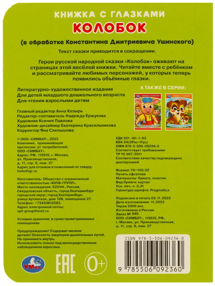 💳 Оплатить за товар можно при получении 🇰🇿 Есть бесплатная доставка по Казахстану от 1 дня 🎁 Копите бонусы с каждой покупки Серия: Книжка с глазками На страницах этой яркой книги малыша ждёт встреча с героями известной русской народной сказки. Большие красочные картинки и подвижные глазки, благодаря которым персонажи выглядят совсем как живые, вызовут полный восторг малыша. Компактный размер книги позволяет взять её с собой в путешествие. Чтение книги с глазками ТМ «УМка» и игра с ней развивают мелкую моторику, образное мышление, визуальное восприятие, внимание, память, речь. |
