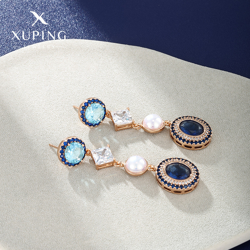 Красиво не значит-дорого. Рады предложить вам ювелирную бижутерию высокого качества фабрики xuping. Эта брендовая бижутерия визуально не отличается от настоящего золота и будет долго радовать вас своим изысканным внешним видом. Лёгкие серёжки золотистого цвета выполнены из специального медицинского гипоаллергенного сплава с золотым покрытием, украшены сверкающими прозрачными фианитами и синим кубическим цирконием, не раздражают кожу, не боятся воды, не темнеют, не меняют цвет и внешне не отличить от изделий из благородных металлов.