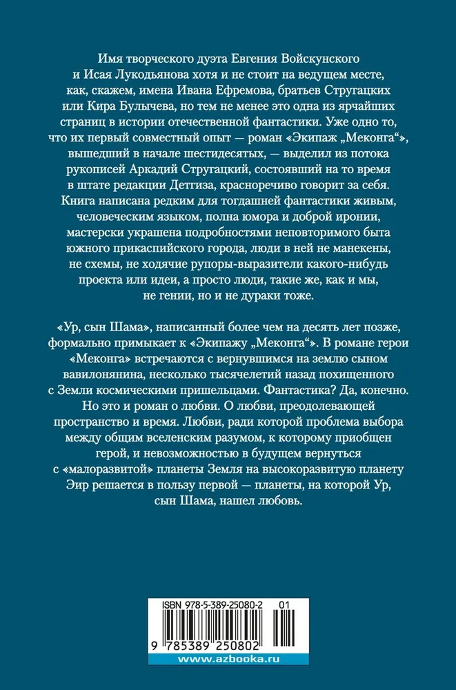 💳 Оплатить за товар можно при получении 🇰🇿 Есть бесплатная доставка по Казахстану от 1 дня 🎁 Копите бонусы с каждой покупки Серия: Фантастика и фэнтези. Большие книги Имя творческого дуэта Евгения Войскунского и Исая Лукодьянова хотя и не стоит на ведущем месте, как, скажем, имена Ивана Ефремова, братьев Стругацких или Кира Булычева, но тем не менее это одна из ярчайших страниц в истории отечественной фантастики. Уже одно то, что их первый совместный опыт — роман «Экипаж «Меконга», вышедший в начале шестидесятых, — выделил из потока рукописей Аркадий Стругацкий, состоявший на то время в штате редакции Детгиза, красноречиво говорит за себя. Книга написана редким для тогдашней фантастики живым, человеческим языком, полна юмора и доброй иронии, мастерски украшена подробностями неповторимого быта южного прикаспийского города, люди в ней не манекены, не схемы, не ходячие рупоры-выразители какого-нибудь проекта или идеи, а просто люди, такие же, как и мы, не гении, но и не дураки тоже. «Ур, сын Шама», написанный более чем на десять лет позже, формально примыкает к «Экипажу «Меконга». В романе герои «Меконга» встречаются с вернувшимся на землю сыном вавилонянина, несколько тысячелетий назад похищенного с Земли космическими пришельцами. Фантастика? Да, конечно. Но это и роман о любви. О любви, преодолевающей пространство и время. Любви, ради которой проблема выбора между общим вселенским разумом, к которому приобщен герой, и невозможностью в будущем вернуться с «малоразвитой» планеты Земля на высокоразвитую планету Эир решается в пользу первой — планеты, на которой Ур, сын Шама, нашел любовь. |