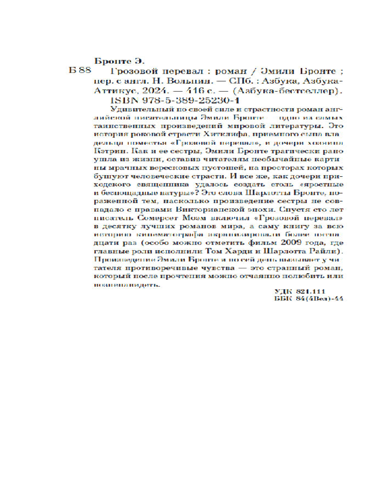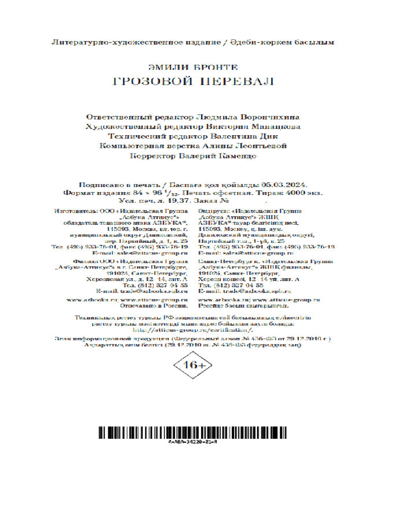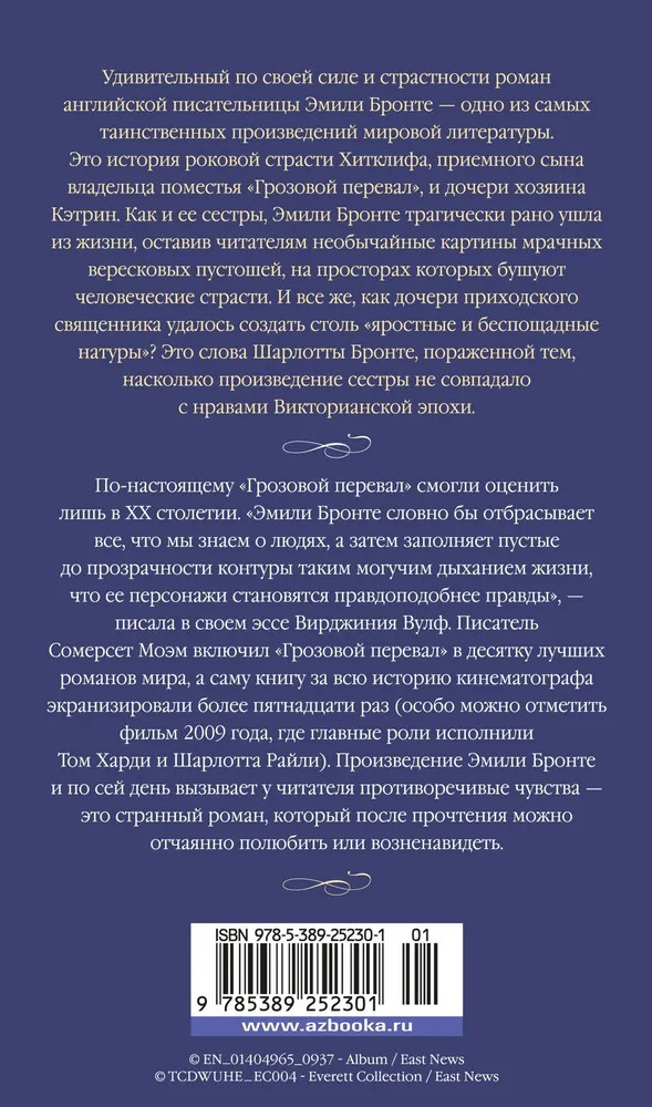 💳 Оплатить за товар можно при получении 🇰🇿 Есть бесплатная доставка по Казахстану от 1 дня 🎁 Копите бонусы с каждой покупки Серия: Азбука-бестселлер Удивительный по своей силе и страстности роман английской писательницы Эмили Бронте — одно из самых таинственных произведений мировой литературы. Это история роковой страсти Хитклифа, приемного сына владельца поместья «Грозовой перевал», и дочери хозяина Кэтрин. Как и ее сестры, Эмили Бронте трагически рано ушла из жизни, оставив читателям необычайные картины мрачных вересковых пустошей, на просторах которых бушуют человеческие страсти. И все же, как дочери приходского священника удалось создать столь «яростные и беспощадные натуры»? Это слова Шарлотты Бронте, пораженной тем, насколько произведение сестры не совпадало с нравами Викторианской эпохи. Спустя сто лет писатель Сомерсет Моэм включил «Грозовой перевал» в десятку лучших романов мира, а саму книгу за всю историю кинематографа экранизировали более пятнадцати раз (особо можно отметить фильм 2009 года, где главные роли исполнили Том Харди и Шарлотта Райли). Произведение Эмили Бронте и по сей день вызывает у читателя противоречивые чувства — это странный роман, который после прочтения можно отчаянно полюбить или возненавидеть. |