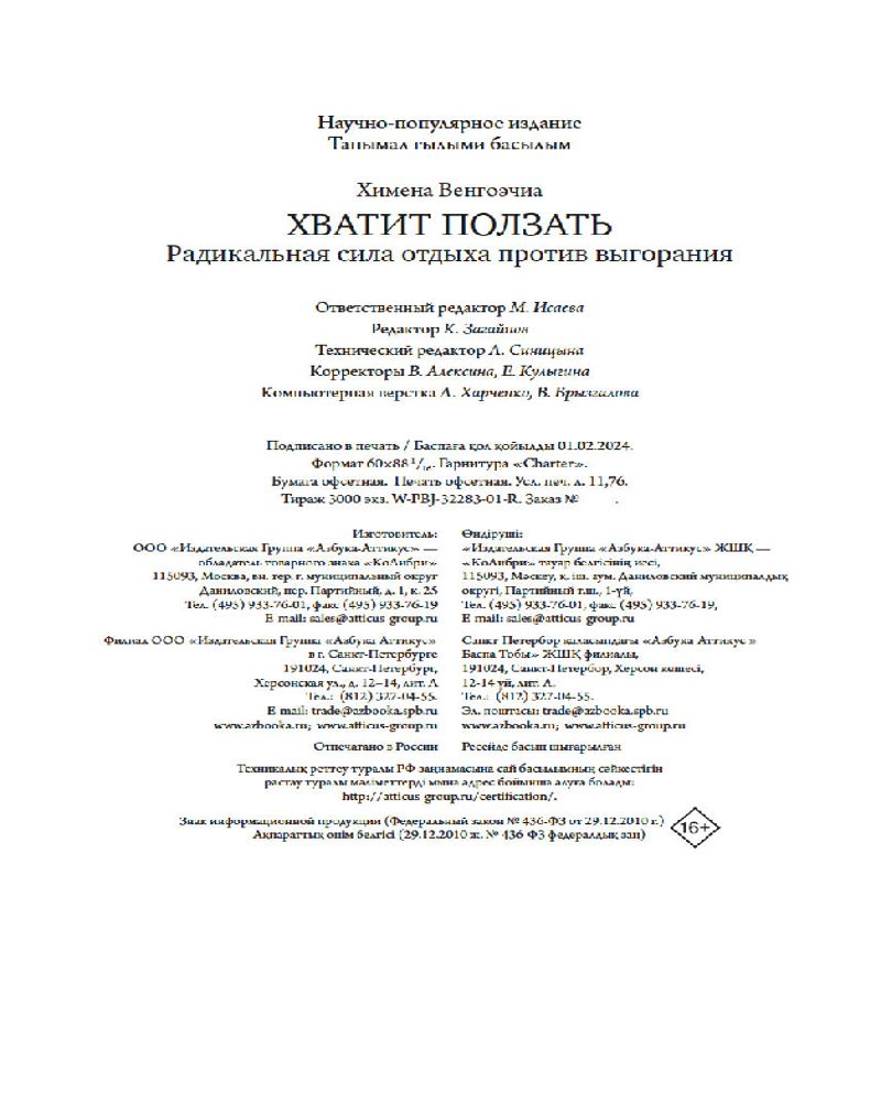 💳 Оплатить за товар можно при получении 🇰🇿 Есть бесплатная доставка по Казахстану от 1 дня 🎁 Копите бонусы с каждой покупки Серия: Популярная психология для бизнеса и жизни Как вы чувствуете себя в мире, где успех определяется тем, насколько выше своей головы вы сможете прыгнуть сегодня? И завтра, и каждый день после этого? Попробуем угадать: эмоционально истощенным, хронически усталым и начисто лишенным желания что-либо делать. Более того, скорее всего вам не помогают ни вечер за просмотром сериалов, ни заедание негатива печеньками. Вы ищете возможность отдохнуть по-настоящему, но просто не знаете как. Так что же делать? Эксперт по практикам эффективной релаксации Химена Венгоэчиа точно знает ответ. В этой книге она познакомит вас с десятками проверенных методов расслабления и восстановления, объяснит, какие полезные привычки завести, а от каких паттернов — отказаться, и поможет найти баланс между работой и отдыхом, чтобы избежать выгорания в будущем. Доступные для каждого, эти практики помогут снизить общий уровень стресса, освободиться от постоянной тревоги и восстановить запас энергии. Ощутите на себе радикальную силу отдыха и расправьте крылья! |