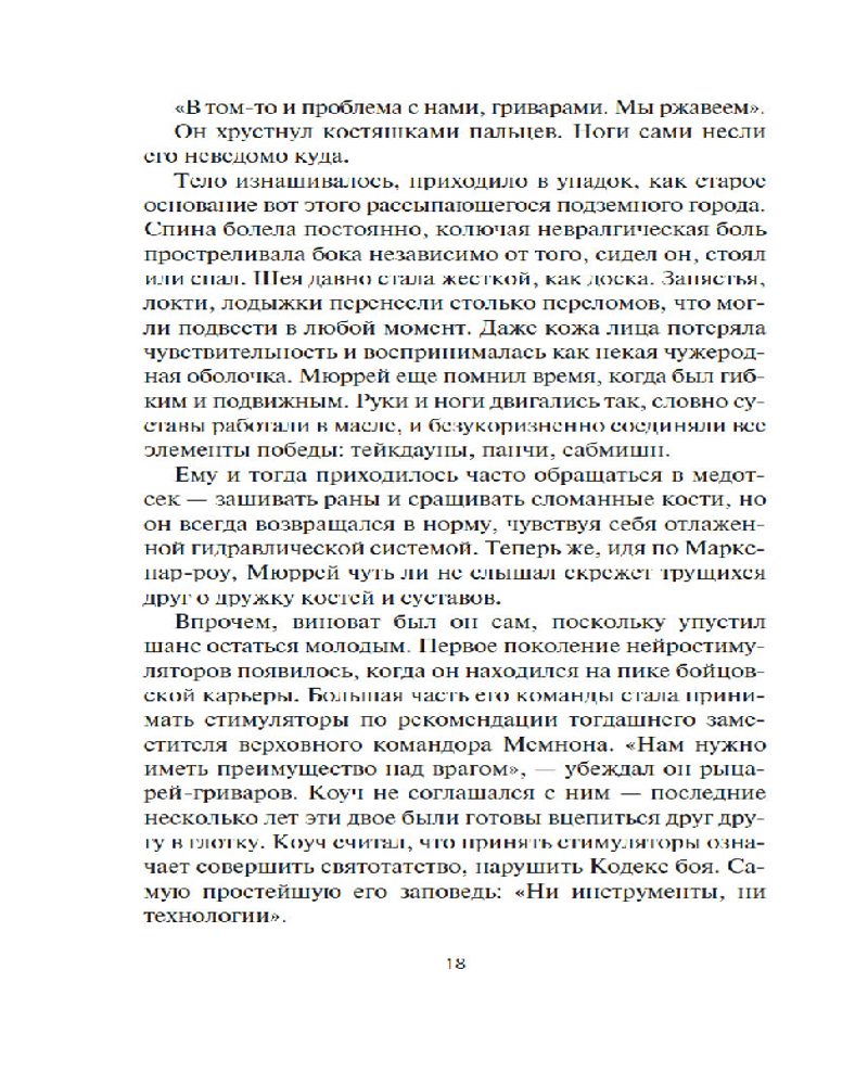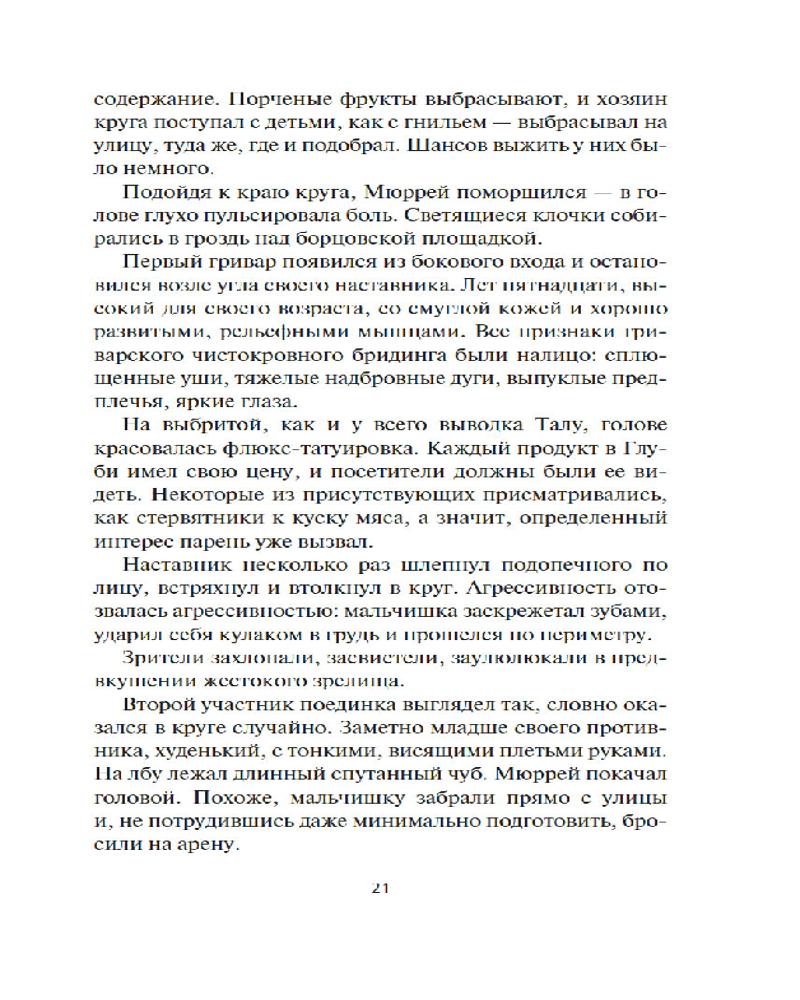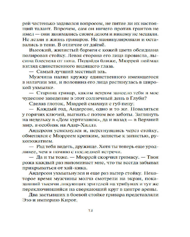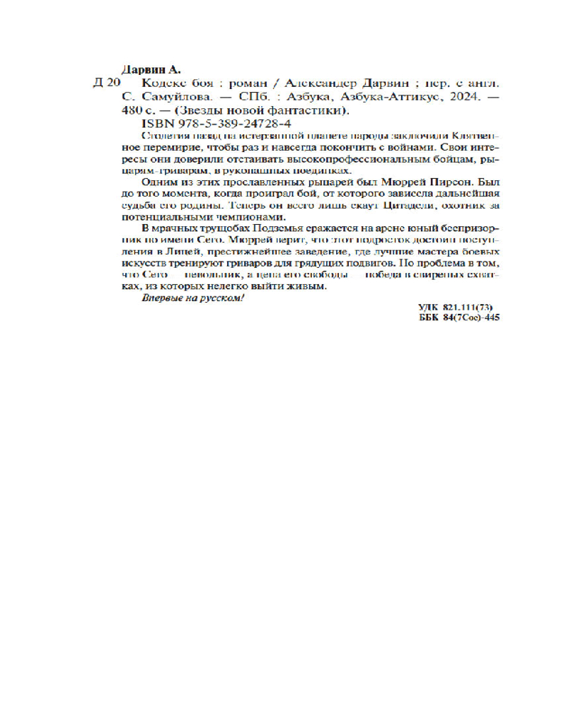 💳 Оплатить за товар можно при получении 🇰🇿 Есть бесплатная доставка по Казахстану от 1 дня 🎁 Копите бонусы с каждой покупки Серия: Звезды новой фантастики Столетия назад на истерзанной планете народы заключили Клятвенное перемирие, чтобы раз и навсегда покончить с войнами. Свои интересы они доверили отстаивать высокопрофессиональным бойцам, рыцарям-гриварам, в рукопашных поединках. Одним из этих прославленных рыцарей был Мюррей Пирсон. Был до того момента, когда проиграл бой, от которого зависела дальнейшая судьба его родины. Теперь он всего лишь скаут Цитадели, охотник за потенциальными чемпионами. В мрачных трущобах Подземья сражается на арене юный беспризорник по имени Сего. Мюррей верит, что этот подросток достоин поступления в Лицей, престижнейшее заведение, где лучшие мастера боевых искусств тренируют гриваров для грядущих подвигов. Но проблема в том, что Сего — невольник, а цена его свободы — победа в свирепых схватках, из которых нелегко выйти живым. Впервые на русском! |