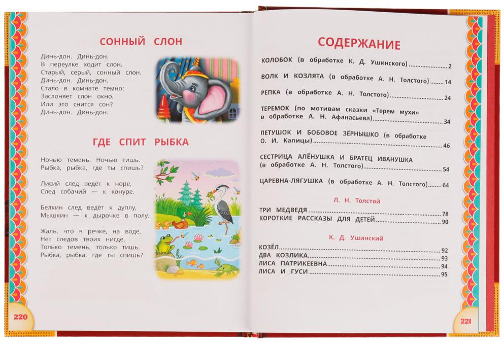 • сказки в обработке К. Д. Ушинского, А. Н. Толстого, А. Н. Афанасьева: «Колобок», «Волк и козлята», «Репка», «Теремок», «Петушок и бобовое зёрнышко», «Сестрица Алёнушка и братец Иванушка», «Царевна-лягушка»;