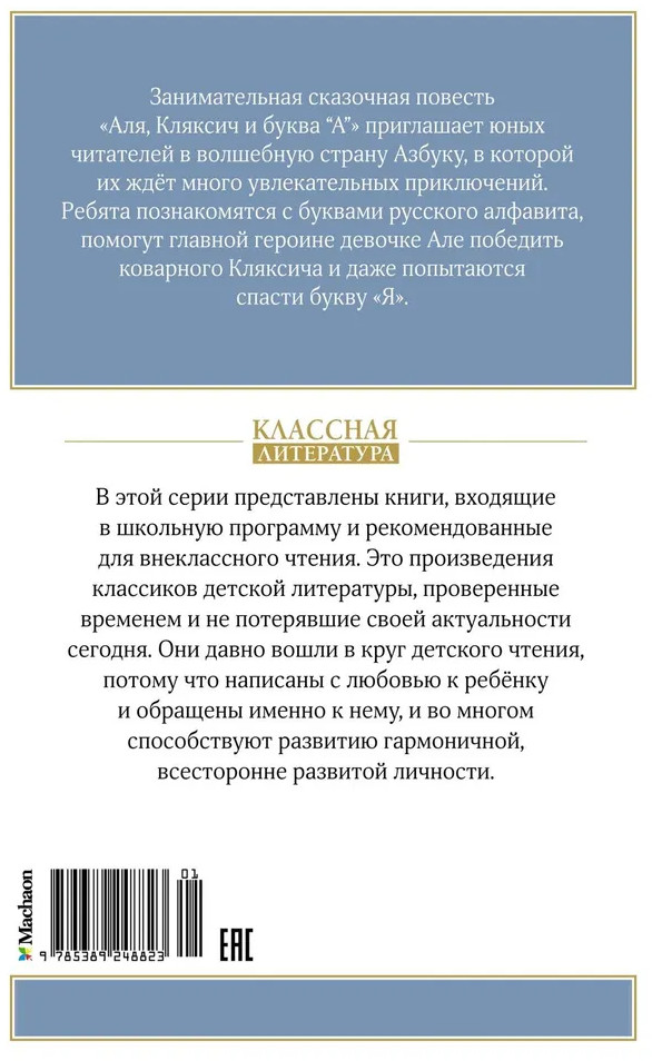 💳 Оплатить за товар можно при получении 🇰🇿 Есть бесплатная доставка по Казахстану от 1 дня 🎁 Копите бонусы с каждой покупки Серия: Классная литература Занимательная сказочная повесть «Аля, Кляксич и буква «А» приглашает юных читателей в волшебную страну Азбуку, в которой их ждёт много увлекательных приключений. Ребята познакомятся с буквами русского алфавита, помогут главной героине девочке Але победить коварного Кляксича и даже попытаются спасти букву «Я». |