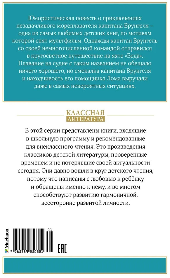 💳 Оплатить за товар можно при получении 🇰🇿 Есть бесплатная доставка по Казахстану от 1 дня 🎁 Копите бонусы с каждой покупки Серия: Классная литература Юмористическая повесть о приключениях незадачливого мореплавателя капитана Врунгеля — одна из самых любимых детских книг, по мотивам которой снят мультфильм. Однажды капитан Врунгель со своей немногочисленной командой отправился в кругосветное путешествие на яхте «Беда». Плавание на судне с таким названием не обещало ничего хорошо, но смекалка капитана Врунгеля и находчивость его помощника Лома выручали даже в самых невероятных ситуациях. |