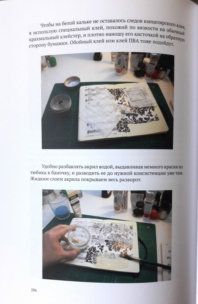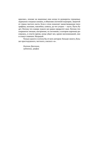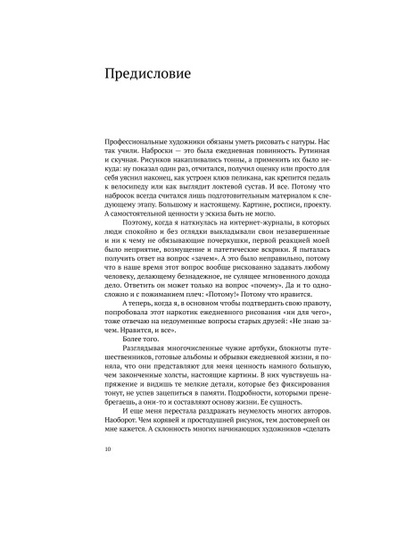В своей второй книге Натали продолжает придавать уверенности в себе робким рисовальщикам, а также развивает тему ведения арт-дневников и обосновывает пользу этого занятия. Кроме очередных полезных подбадриваний, которые подталкивают к рисованию, в книге даются практические советы как самостоятельно сшить-склеить блокнот по своему вкусу, как начать в нем работу, какие подручные материалы использовать и так далее. Лично для меня книги Ратковски послужили хорошим творческим «пинком», побуждением к действию, а это самая лучшая рекомендация. Все мои разрозненные зарисовки-почеркушки, лежавшие мертвым культурным слоем, вдруг начали обретать свой «дом». Получившийся артбук удобно использовать, если возникнет творческий застой и можно будет почерпнуть у себя же вдохновение. А потраченное на оформление страниц артбука время служит прекрасной зарядкой для вашей творческой составляющей. К тому же я поняла принцип переплета книг и применяю эти знания с большой пользой для себя. Книга дорогая, но качество полиграфии очень высокое. Страницы плотные, мелованные, а фото на них глянцевые. Фолиант очень увесистый, с собой не потаскаешь.