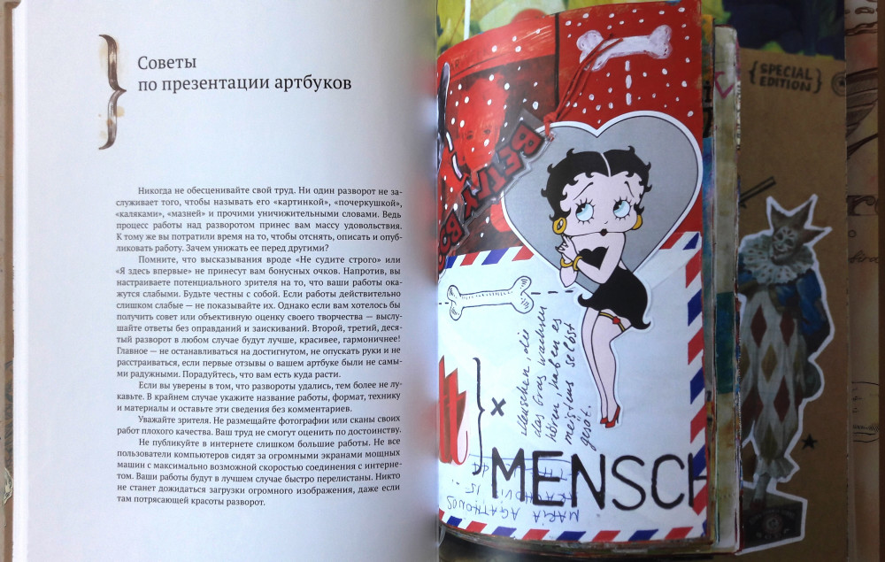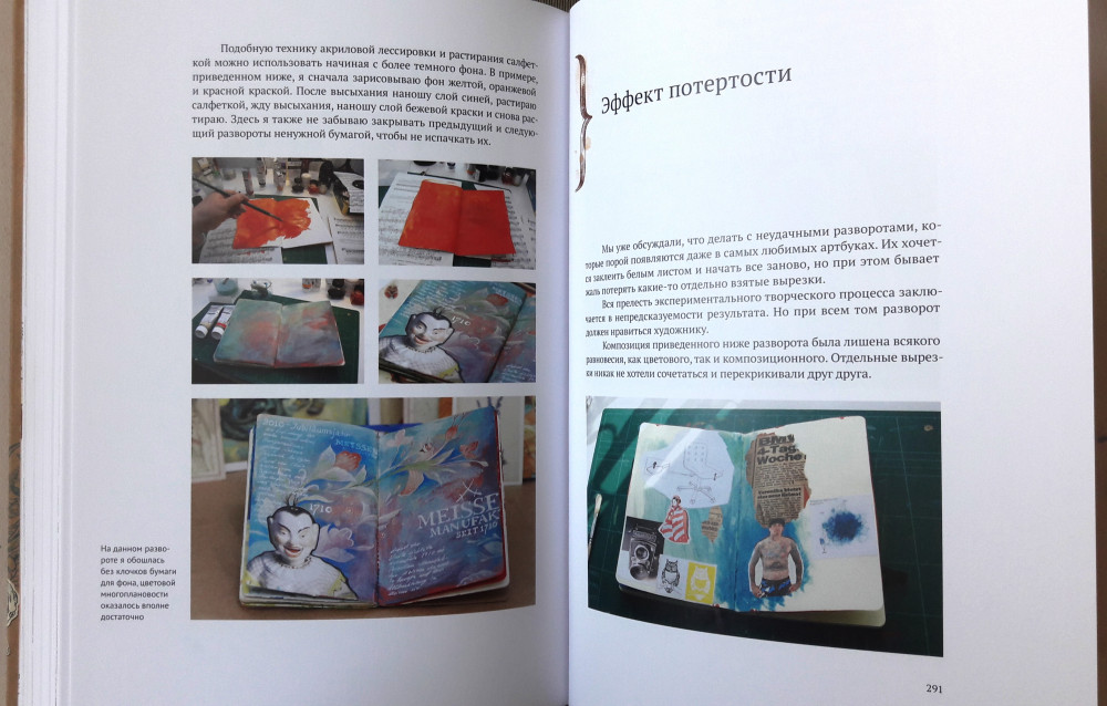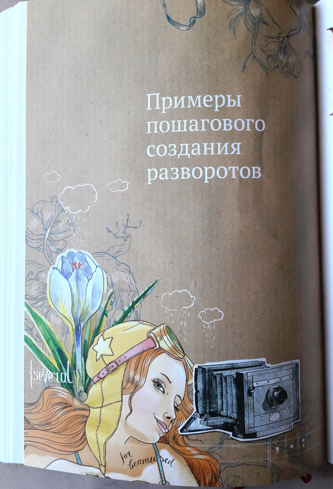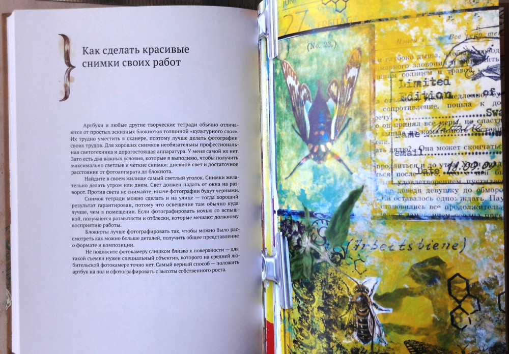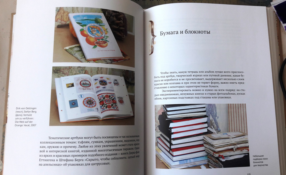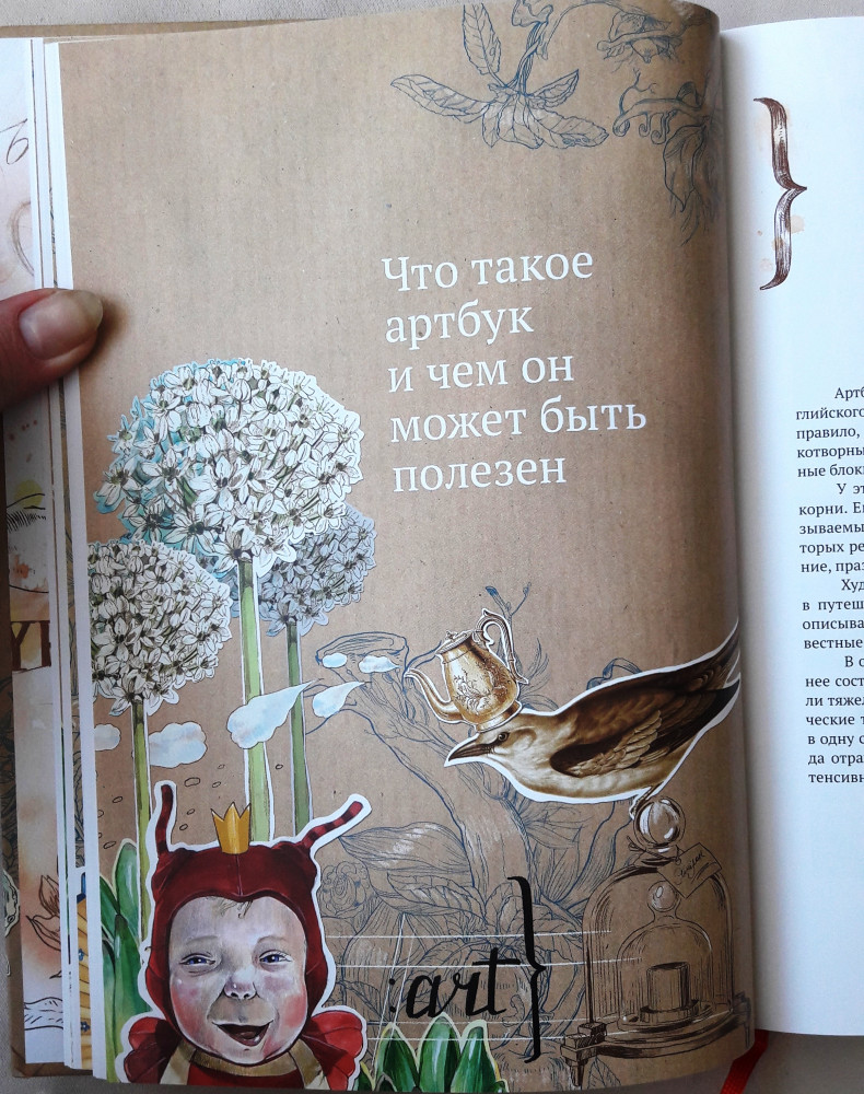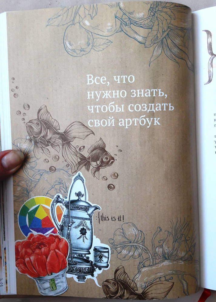 Когда я только заказывала эту книгу, я особо ничего от нее не ждала. Артбуки, скрапбуки - это не мое. Читала первую книгу Натали и только поэтому решила купить - стало интересно, что будет в следующей. Книгу я прочла за 2 дня. Она стала моим вдохновением, сразу же обросла кучей закладок (тут ссылка на интересный ресурс, здесь интересная техника и материалы, а там красивая иллюстрация). Как и в первой своей книге, автор легко и непринужденно убеждает читателя, что творчество это удел не только человека, который отдал этому 10 лет художки и 5 лет училища или института, что каждый человек рожден с творческой жилкой. В книге рассказывается зачем нужны артбуки, как, из чего их делать. хороший экскурс по материалам и техникам, упражнения на развитие фантазии. Что касается издания, то книга очень качественная. Странички плотные, картинки яркие, сочные. В общем, даже если тема артбуков вас не особо привлекает, но вас тянет творить, и вы не знаете с чего начать, или начинать боитесь, то эта книга для вас!