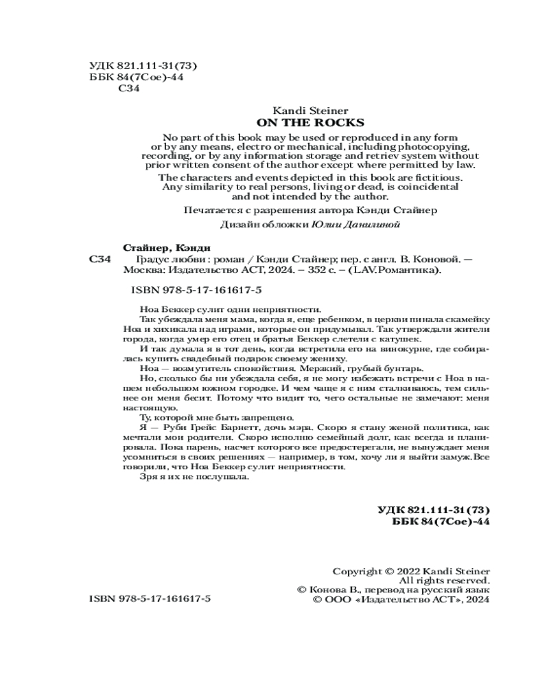 💳 Оплатить за товар можно при получении 🇰🇿 Есть бесплатная доставка по Казахстану от 1 дня 🎁 Копите бонусы с каждой покупки Серия: LAV. Романтика Ноа Беккер сулит одни неприятности. Так убеждала меня мама, когда я, еще ребенком, в церкви пинала скамейку Ноа и хихикала над играми, которые он придумывал. Так утверждали жители города, когда умер его отец и братья Беккер слетели с катушек. И так думала я в тот день, когда шла на винокурню, где он работал, чтобы купить свадебный подарок своему жениху. |