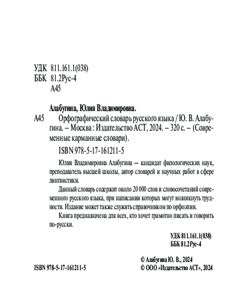 💳 Оплатить за товар можно при получении 🇰🇿 Есть бесплатная доставка по Казахстану от 1 дня 🎁 Копите бонусы с каждой покупки Серия: Современные карманные словари Юлия Владимировна Алабугина — кандидат филологических наук, преподаватель высшей школы, автор словарей и научных работ в сфере лингвистики. Данный словарь содержит около 20 000 слов и словосочетаний современного русского языка, при написании которых могут возникнуть трудности. Издание может также служить справочником по орфоэпии. Книга предназначена для всех, кто хочет грамотно писать и говорить по-русски. |