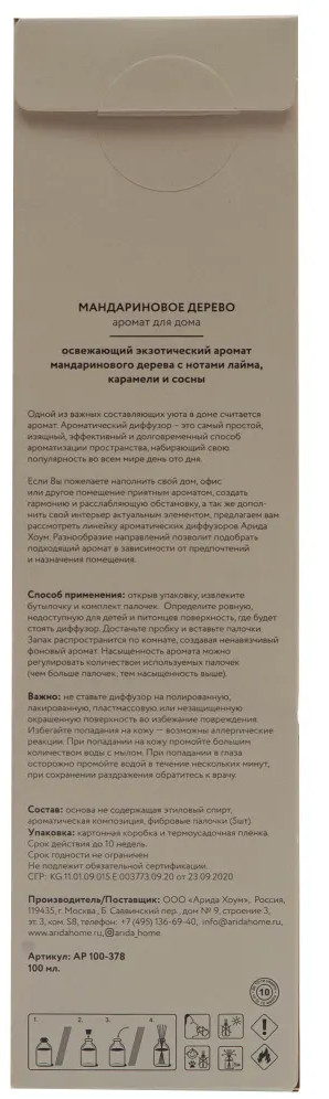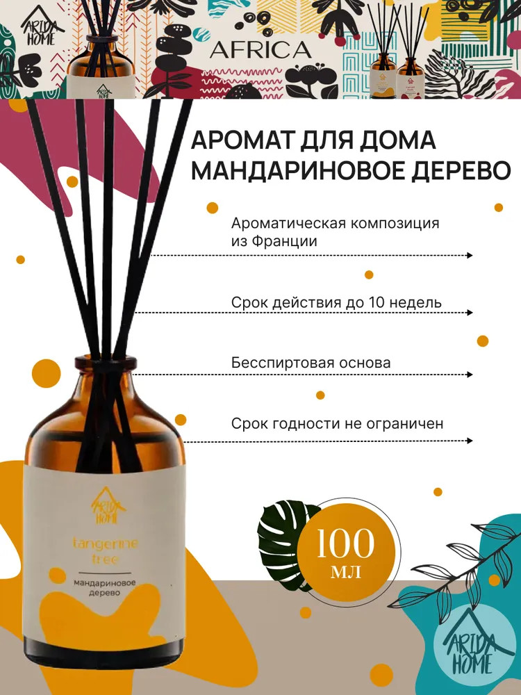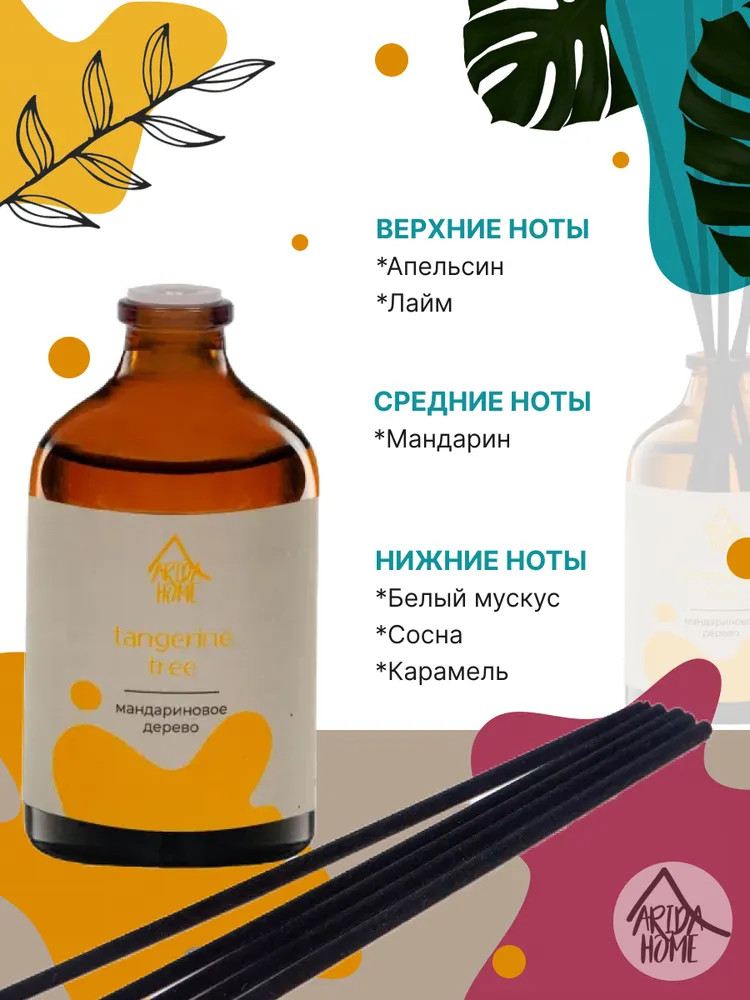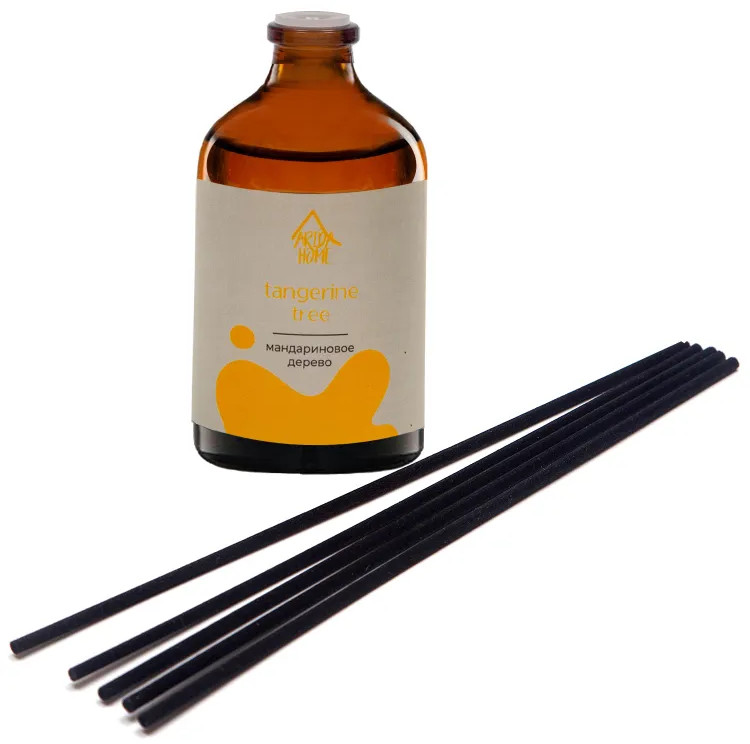 Ароматический диффузор Arida Home «Мандариновое дерево» — простое и удобное решение, при помощи которого за считанные минуты можно наполнить помещение (жилое или офисное) ненавязчивым приятным ароматом. Способствует формированию уютной и расслабляющей обстановки. Характеризуется простотой использования. Достаточно установить бутылочку на ровную поверхность, недоступную для детей и питомцев, и поместить в нее палочки — при помощи количества последних можно регулировать интенсивность аромата. Во избежание повреждений не рекомендуется ставить диффузор на следующие поверхности: полированную, лакированную, пластмассовую или незащищенную окрашенную.