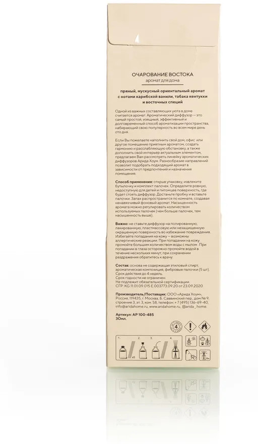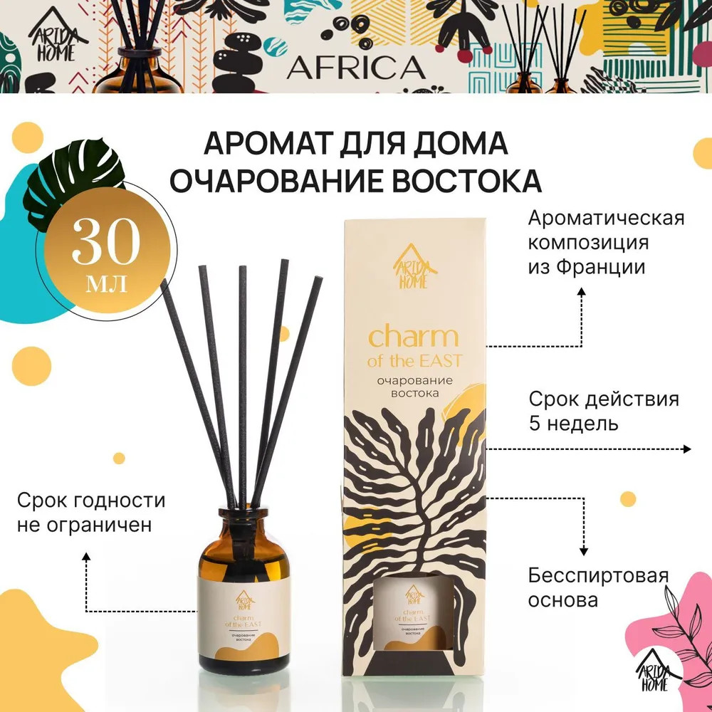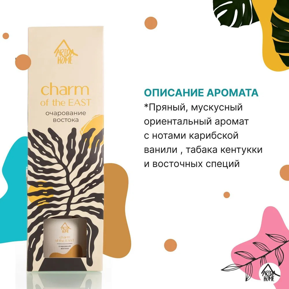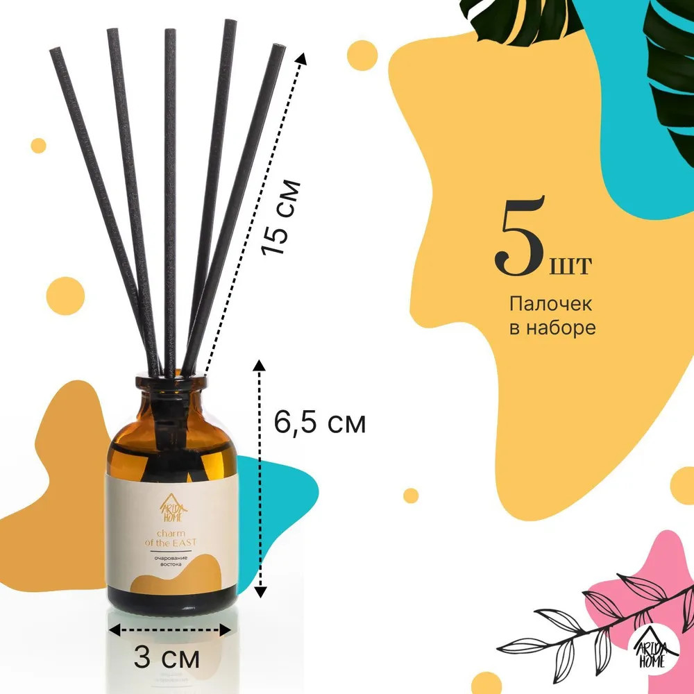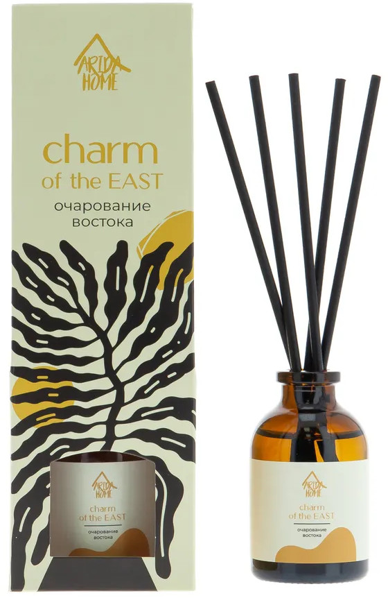 Ароматический диффузор Arida Home «Очарование востока» — простое и удобное решение, при помощи которого за считанные минуты можно наполнить помещение (жилое или офисное) ненавязчивым приятным ароматом. Способствует формированию уютной и расслабляющей обстановки. Характеризуется простотой использования. Достаточно установить бутылочку на ровную поверхность, недоступную для детей и питомцев, и поместить в нее палочки — при помощи количества последних можно регулировать интенсивность аромата. Во избежание повреждений не рекомендуется ставить диффузор на следующие поверхности: полированную, лакированную, пластмассовую или незащищенную окрашенную.