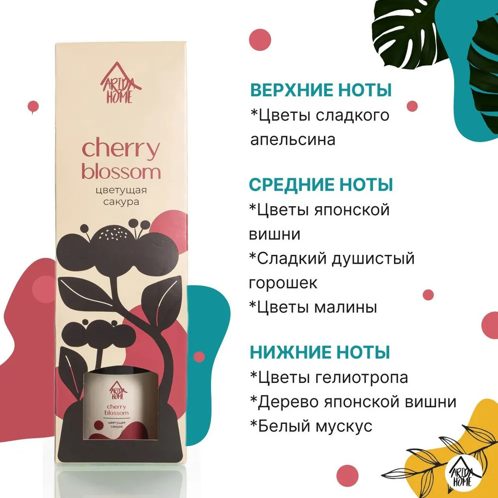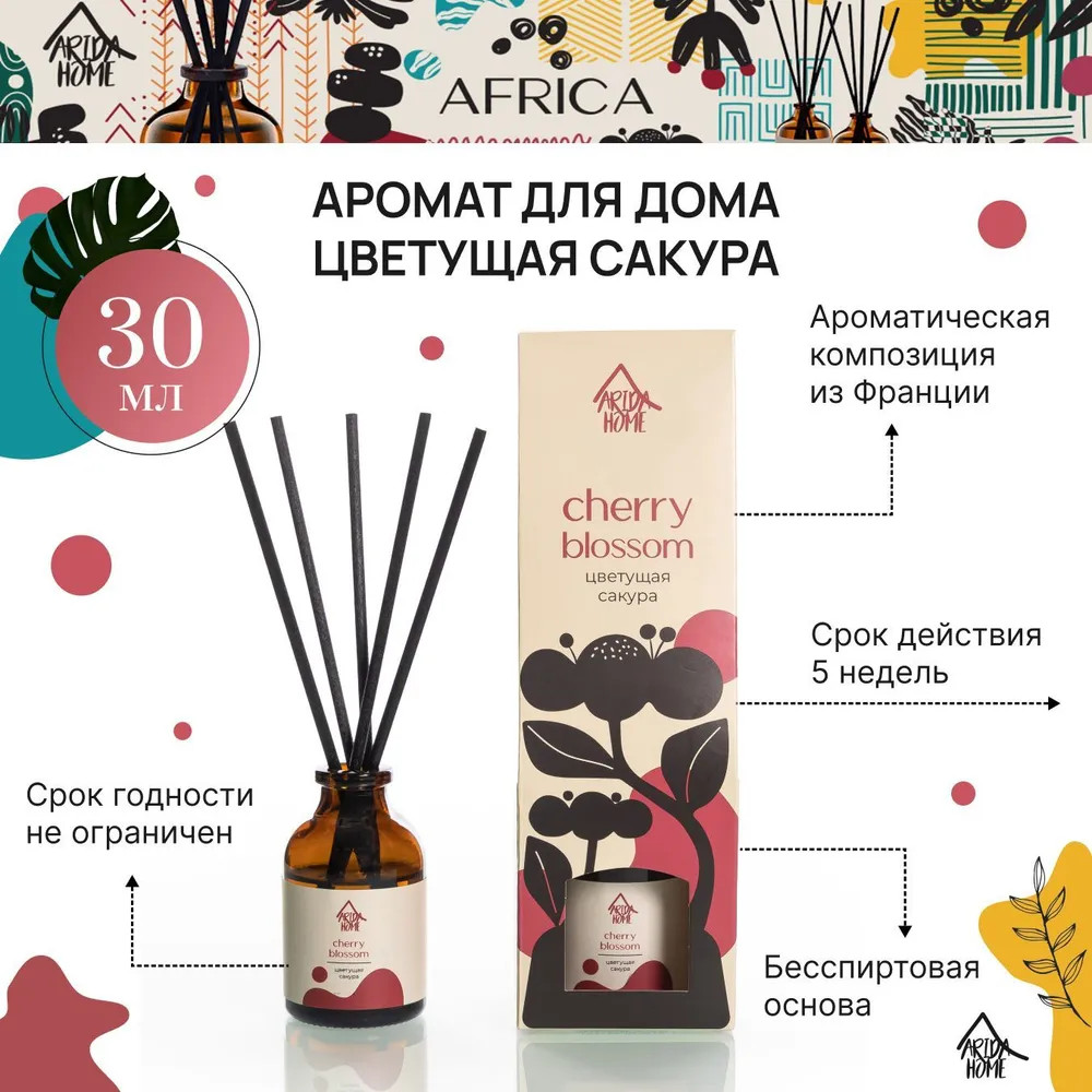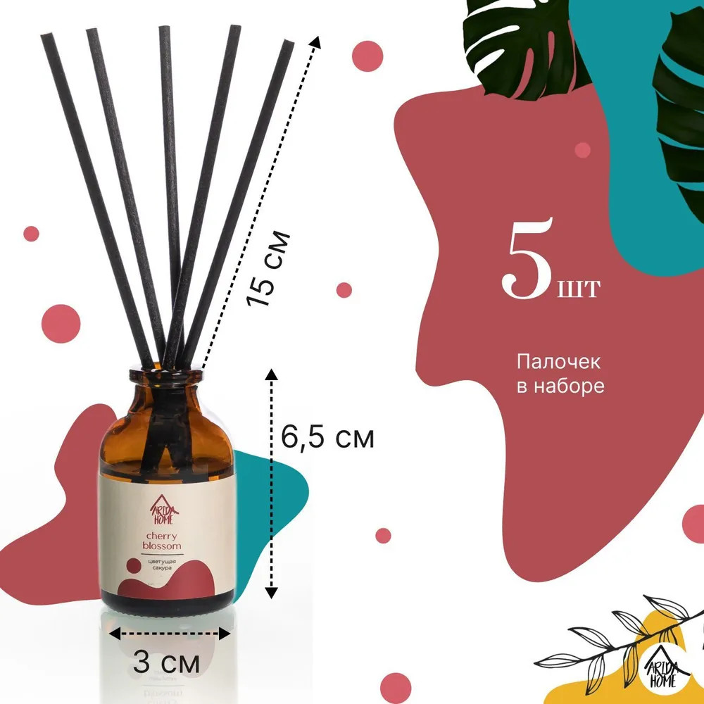 Ароматический диффузор Arida Home «Цветущая сакура» — простое и удобное решение, при помощи которого за считанные минуты можно наполнить помещение (жилое или офисное) ненавязчивым приятным ароматом. Способствует формированию уютной и расслабляющей обстановки. Характеризуется простотой использования. Достаточно установить бутылочку на ровную поверхность, недоступную для детей и питомцев, и поместить в нее палочки — при помощи количества последних можно регулировать интенсивность аромата. Во избежание повреждений не рекомендуется ставить диффузор на следующие поверхности: полированную, лакированную, пластмассовую или незащищенную окрашенную.