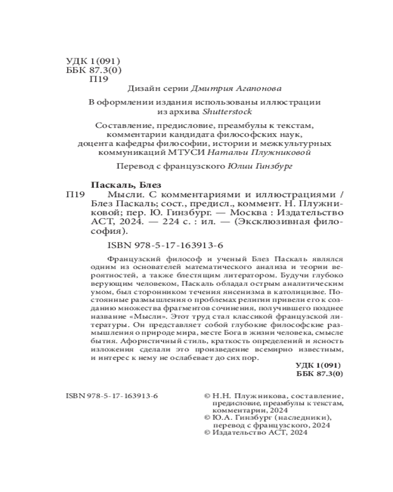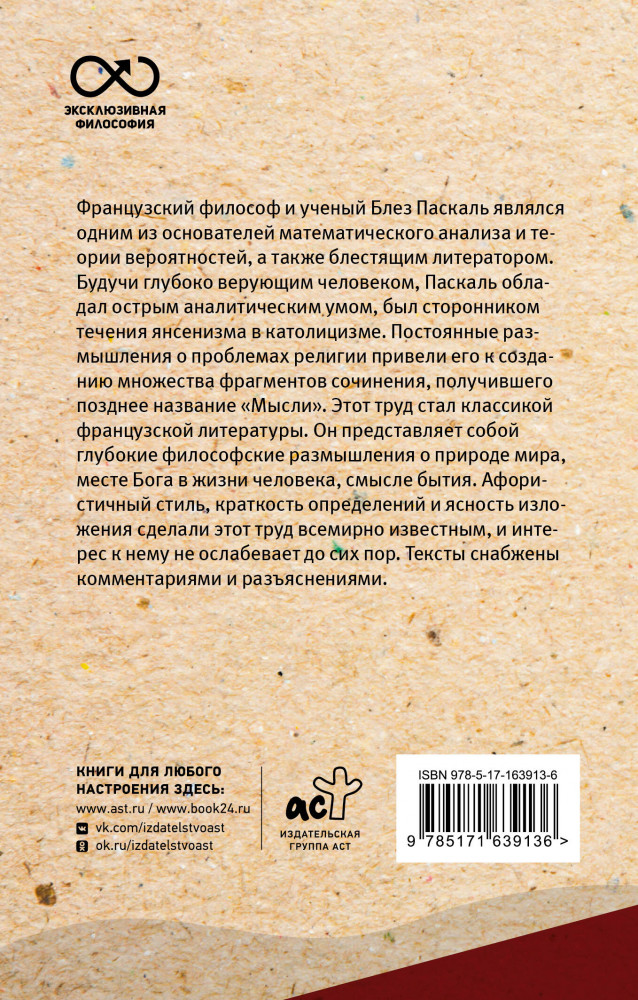 💳 Оплатить за товар можно при получении 🇰🇿 Есть бесплатная доставка по Казахстану от 1 дня 🎁 Копите бонусы с каждой покупки Серия: Эксклюзивная философия Французский философ и ученый Блез Паскаль являлся одним из основателей математического анализа и теории вероятностей, а также блестящим литератором. Будучи глубоко верующим человеком, Паскаль обладал острым аналитическим умом, был сторонником течения янсенизма в католицизме. Постоянные размышления о проблемах религии привели его к созданию множества фрагментов сочинения, получившего позднее название «Мысли». Этот труд стал классикой французской литературы. |