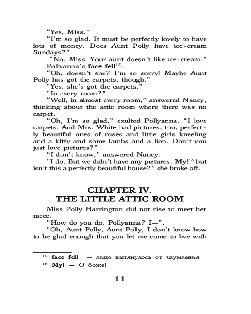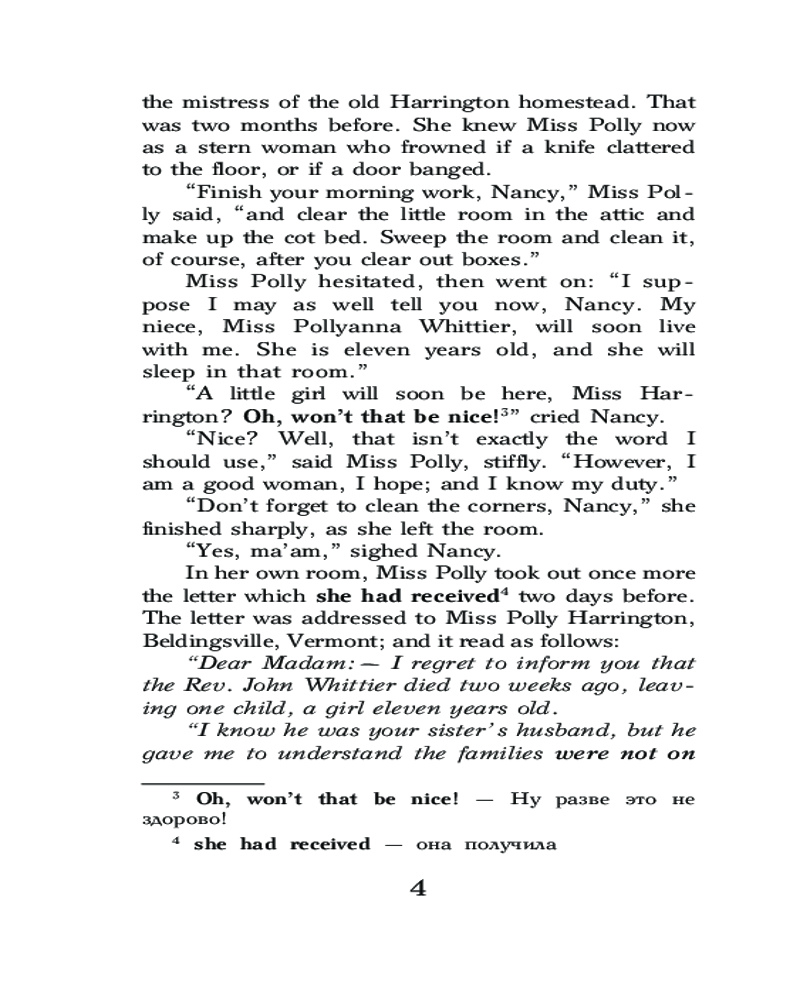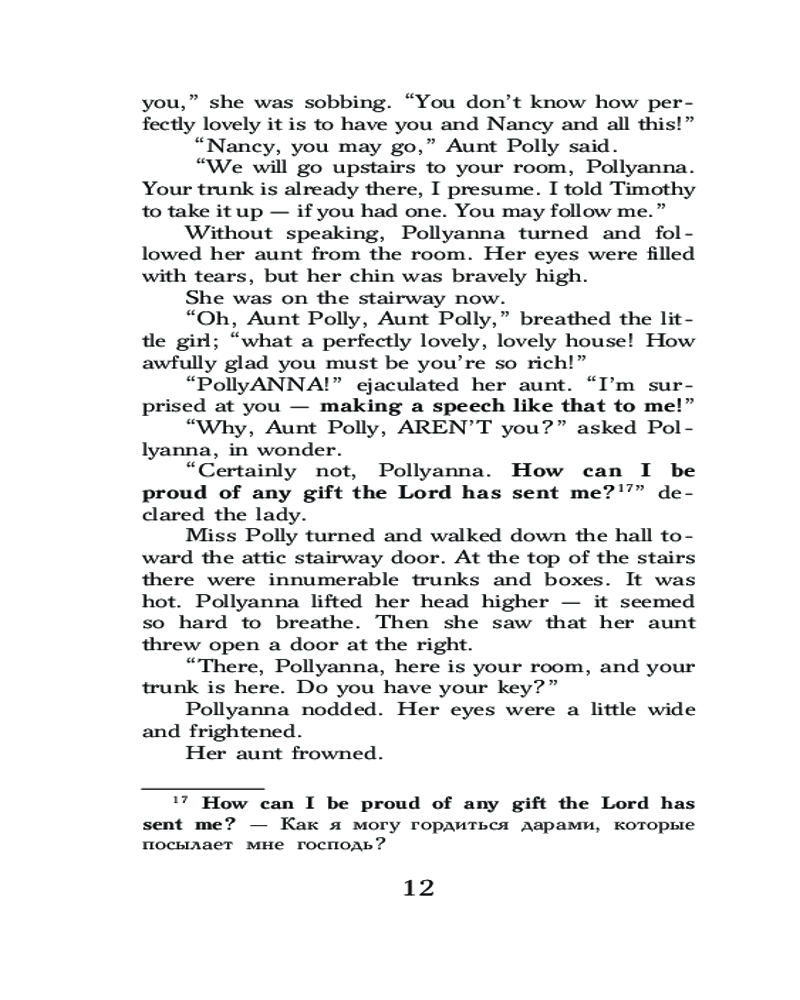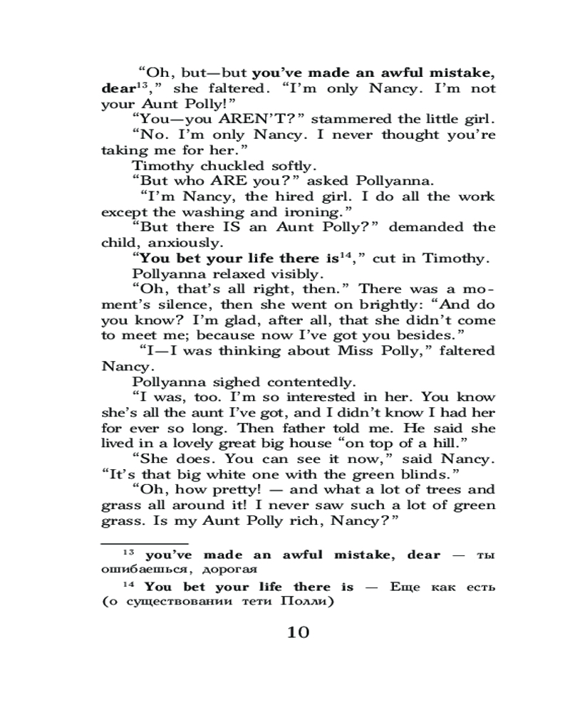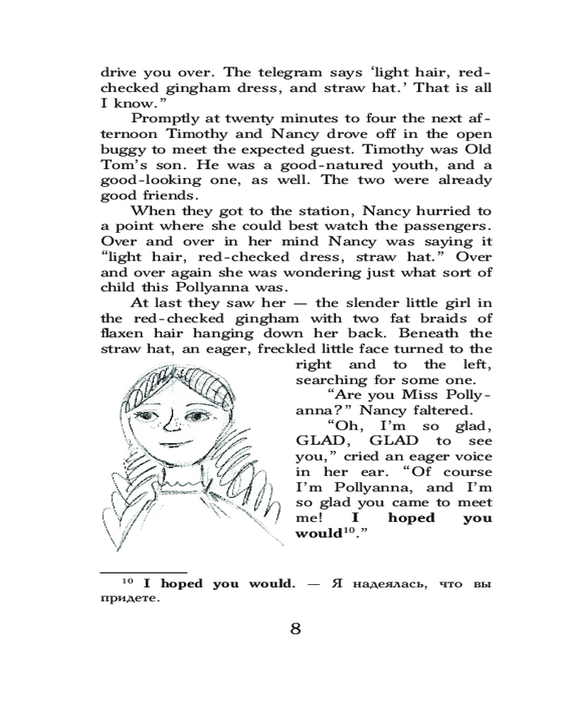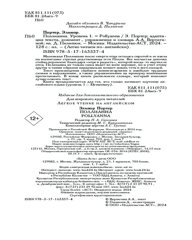 💳 Оплатить за товар можно при получении 🇰🇿 Есть бесплатная доставка по Казахстану от 1 дня 🎁 Копите бонусы с каждой покупки Серия: Легкое чтение на английском Маленькая Поллианна после смерти отца осталась сиротой и ее взяла на воспитание строгая родственница тетя Полли. Все несчастья девочка стойко переносит благодаря «игре в радость», которой когда-то научил ее отец. Поллианна не только сама видит во всем хорошее, но и учит этому других и таким образом кардинально меняет жизнь тети и всех соседей. Текст произведения снабжен комментариями к наиболее трудным словам и выражениям, а также упражнениями на проверку понимания прочитанного. В конце книги расположен словарь, который поможет лучше освоить текст. Книга предназначается для тех, кто только начинает изучение английского языка (уровень 1 — Elementary). |