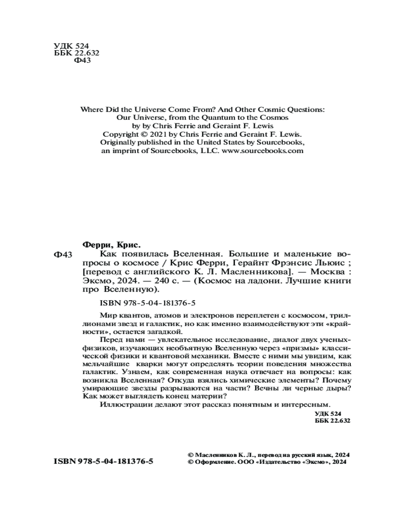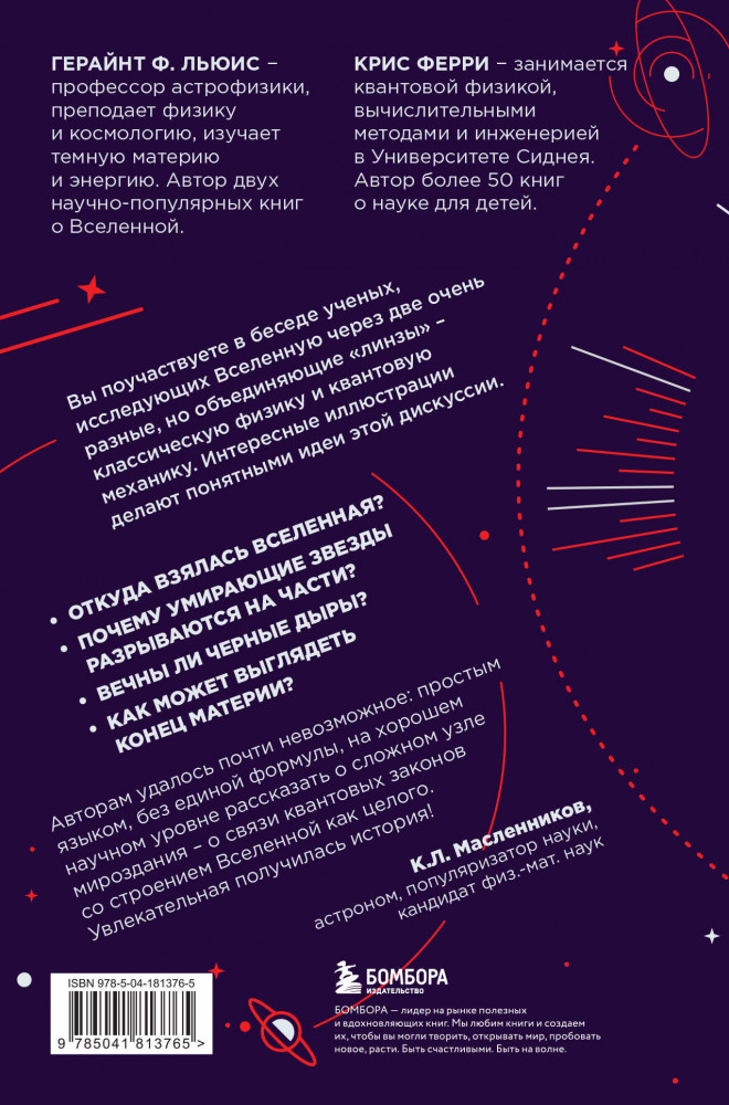 💳 Оплатить за товар можно при получении 🇰🇿 Есть бесплатная доставка по Казахстану от 1 дня 🎁 Копите бонусы с каждой покупки Серия: Космос на ладони. Лучшие книги про Вселенную Кванты — это сверхмалые частицы, кирпичики «всего», космос — это триллионы звёзд и постоянно расширяющихся галактик. Жизнь на необъятных просторах Вселенной неотделима от взаимодействий в масштабах кварков. Объединяя эти измерения, авторы книги — ученые-физики, ведут диалог в поисках ответов на самые фундаментальные вопросы науки: |