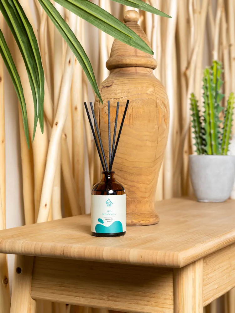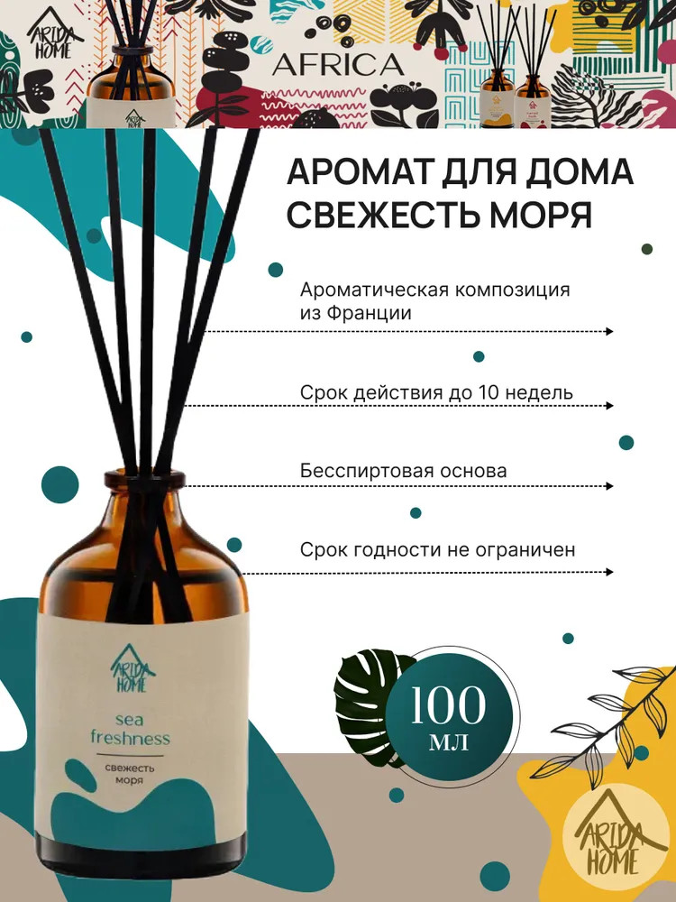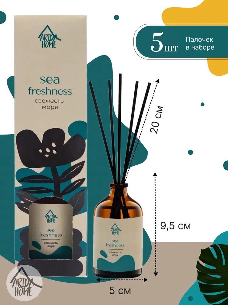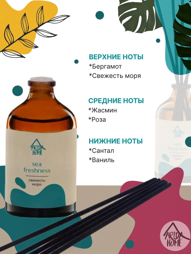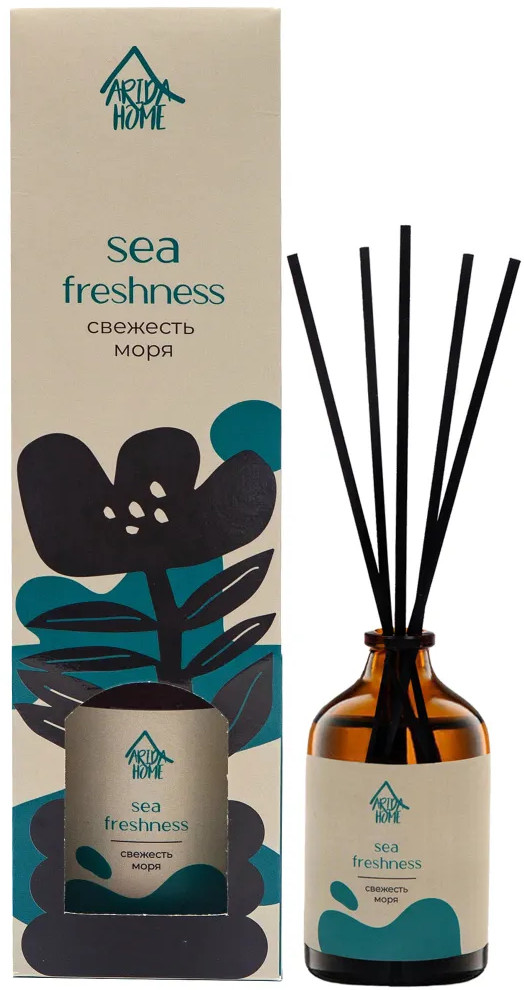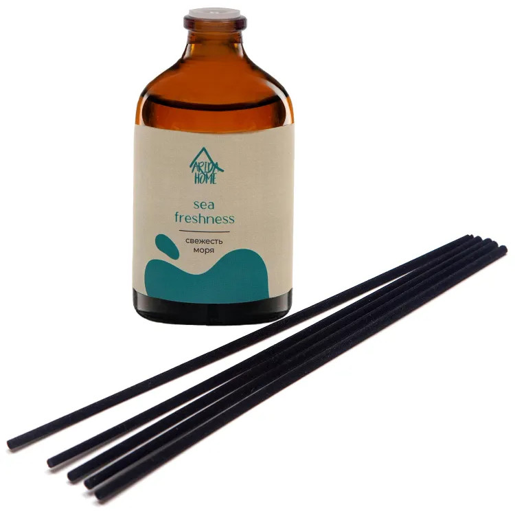 Ароматический диффузор Arida Home «Свежесть моря» — простое и удобное решение, при помощи которого за считанные минуты можно наполнить помещение (жилое или офисное) ненавязчивым приятным ароматом. Способствует формированию уютной и расслабляющей обстановки. Характеризуется простотой использования. Достаточно установить бутылочку на ровную поверхность, недоступную для детей и питомцев, и поместить в нее палочки — при помощи количества последних можно регулировать интенсивность аромата. Во избежание повреждений не рекомендуется ставить диффузор на следующие поверхности: полированную, лакированную, пластмассовую или незащищенную окрашенную.