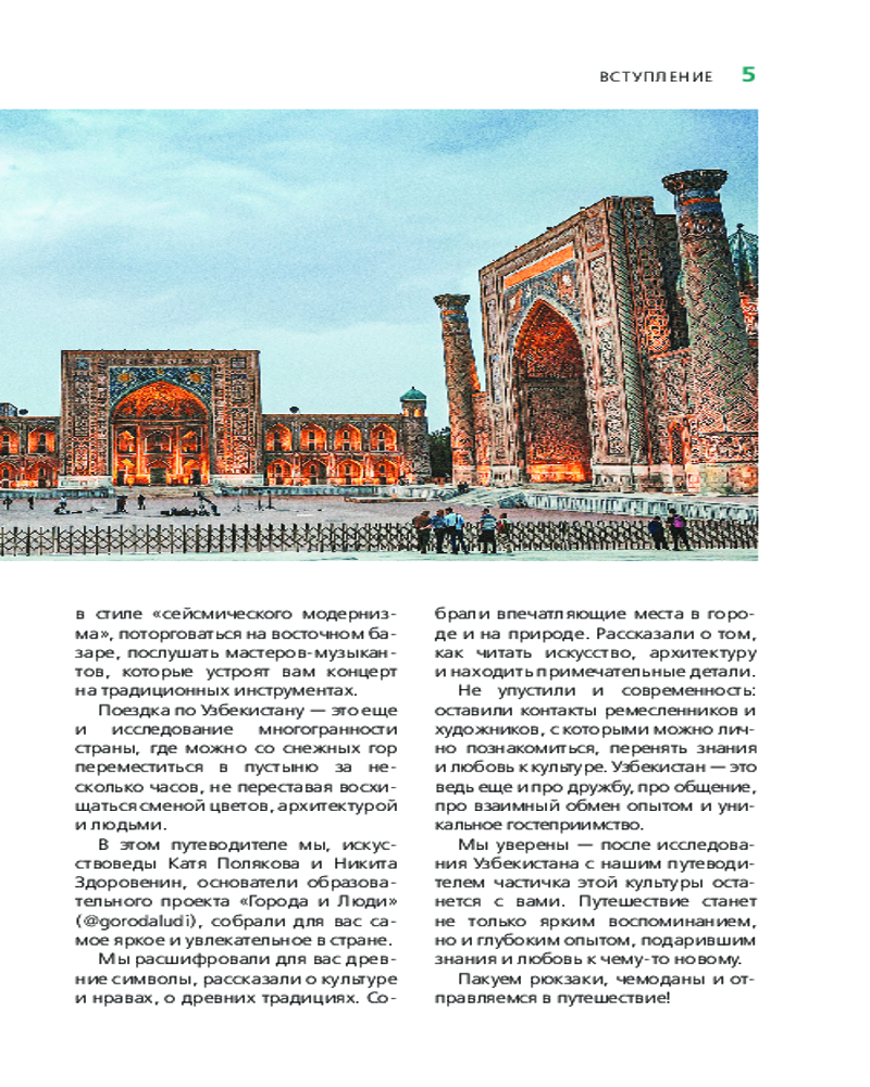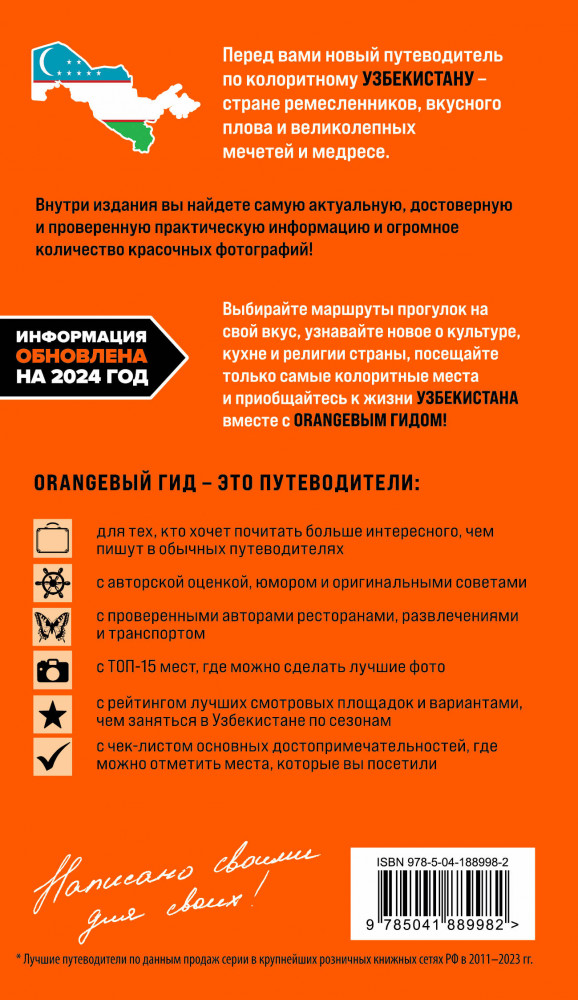 💳 Оплатить за товар можно при получении 🇰🇿 Есть бесплатная доставка по Казахстану от 1 дня 🎁 Копите бонусы с каждой покупки Серия: Оранжевый гид (обложка) Многовековая история, древние города, через которые проходил Великий шелковый путь, восточный колорит, богатая культура и вкусная еда — все это Узбекистан! Отправляйтесь в незабываемое путешествие по стране вместе с нашим Оранжевым гидом! В нем содержится актуальная и полезная информация о главных городах страны, различные маршруты на любой вкус, подсказки, что делать, если идет дождь, или где искать лучшие смотровые площадки, а также множество полезных советов от авторов Екатерины Поляковой и Никиты Здоровенина, основателей образовательного проекта «Города & Люди». |
