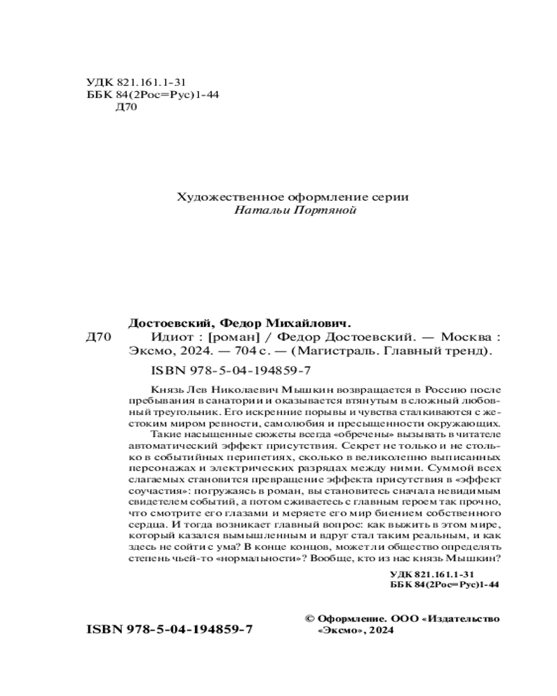 💳 Оплатить за товар можно при получении 🇰🇿 Есть бесплатная доставка по Казахстану от 1 дня 🎁 Копите бонусы с каждой покупки Серия: Магистраль. Главный тренд Такие насыщенные сюжеты всегда «обречены» вызывать в читателе автоматический эффект присутствия. Секрет не только и не столько в событийных перипетиях, сколько в великолепно выписанных персонажах и электрических разрядах между ними. Суммой всех слагаемых становится превращение эффекта присутствия в «эффект соучастия»: погружаясь в роман, вы становитесь сначала невидимым свидетелем событий, а потом сживаетесь с главным героем так прочно, что смотрите его глазами и меряете его мир биением собственного сердца. И тогда возникает главный вопрос: как выжить в этом мире, который казался вымышленным и вдруг стал таким реальным, и как здесь не сойти с ума. В конце концов, может ли общество определять степень чьей-то «нормальности»? Вообще, кто из нас князь Мышкин? |