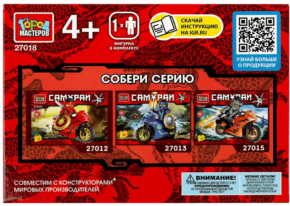Город мастеров Конструктор «Белый самурай на мотоцикле»В данный момент этот товар отсутствует в продаже. Возможно, у нас найдется аналогичный или похожий товар здесь. Серия: Самураи Конструктор «Белый самурай на мотоцикле» из серии «Самураи» ТМ «Город мастеров» станет прекрасным подарком для маленького фантазёра. С помощью этого занимательного конструктора можно собрать яркий байк для храброго самурая и вместе с ним отправиться на поиски приключений. Набор вдохновит ребёнка на новые увлекательные сюжеты для игр и станет гордостью его игрушечной коллекции. |