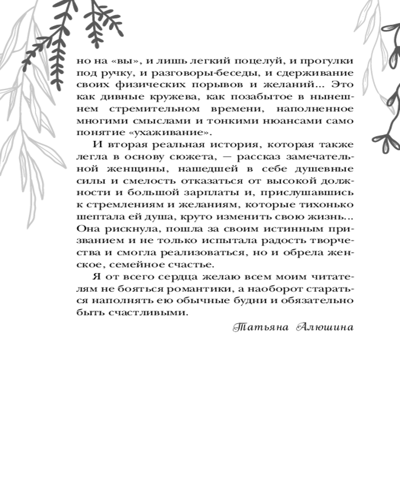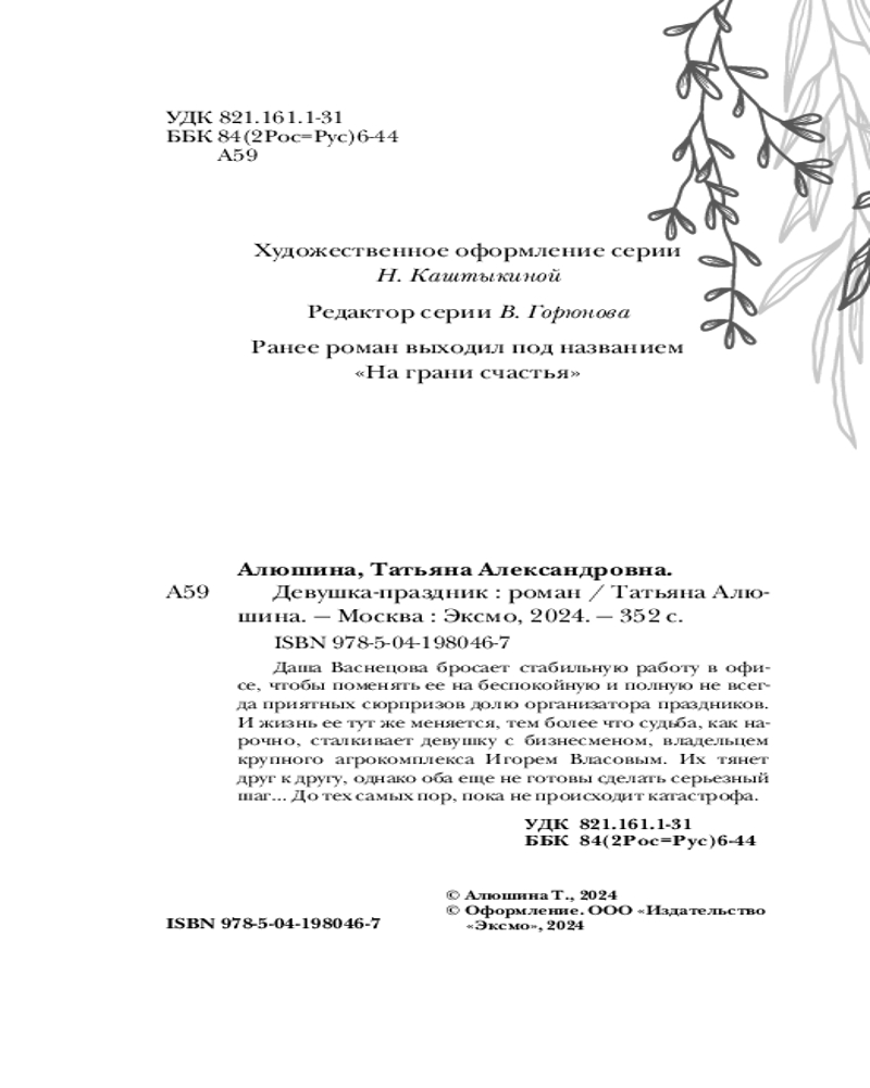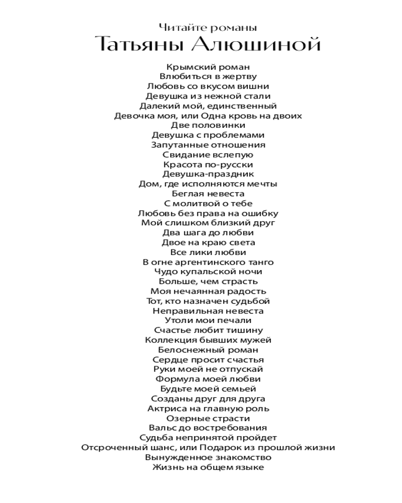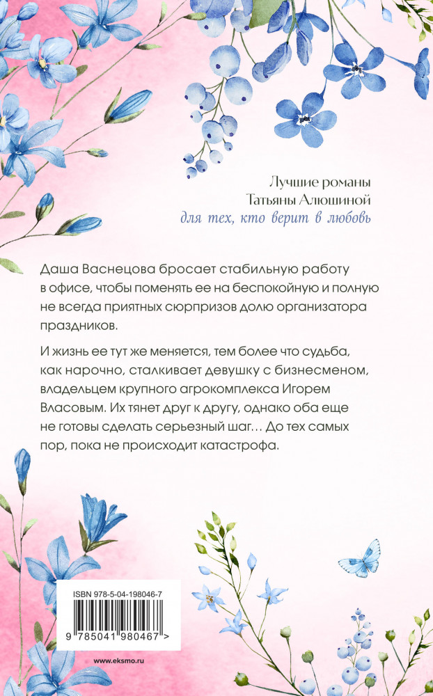 💳 Оплатить за товар можно при получении 🇰🇿 Есть бесплатная доставка по Казахстану от 1 дня 🎁 Копите бонусы с каждой покупки Серия: Еще раз про любовь. Романы Т. Алюшиной (подарочное издание) Романы Татьяны Алюшиной давно заслужили признание читательниц по всей стране, а суммарный тираж ее книг насчитывает более пяти миллионов! Захватывающие сюжеты, незабываемые чувства и подлинная страсть — ее книги читаются на одном дыхании и снова помогают поверить: счастье есть! Даша Васнецова бросает стабильную работу в офисе, чтобы поменять ее на беспокойную и полную не всегда приятных сюрпризов долю организатора праздников. И жизнь ее тут же меняется, тем более что судьба, как нарочно, сталкивает девушку с бизнесменом, владельцем крупного агрокомплекса Игорем Власовым. Их тянет друг к другу, однако оба еще не готовы сделать серьезный шаг... До тех самых пор, пока не происходит катастрофа. |