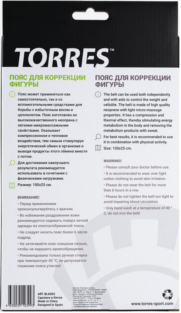 TORRES Пояс для коррекции фигурыВ данный момент этот товар отсутствует в продаже. Возможно, у нас найдется аналогичный или похожий товар здесь. Пояс для коррекции фигуры предназначен для занятий фитнесом, может применяться как самостоятельно, так и со вспомогательными средствами для борьбы с лишним весом и целлюлитом. Пояс изготовлен из высококачественного неопрена с легкими массажными свойствами. Оказывает компрессионное и тепловое воздействие, тем самым стимулируя энергетический обмен в организме и выводя продукты этого обмена вместе с потом. Надежная застежка на «липучке» позволяет плотно зафиксировать пояс на талии, обеспечивая комфорт и легкую компрессию. Размер 100×25 см (толщина 3 мм). |