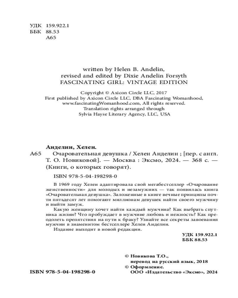 💳 Оплатить за товар можно при получении 🇰🇿 Есть бесплатная доставка по Казахстану от 1 дня 🎁 Копите бонусы с каждой покупки Серия: Книги, о которых говорят В 1969 году Хелен адаптировала свой мегабестселлер «Очарование женственности» для молодых и незамужних — так появилась книга «Очаровательная девушка». Заложенные в книге вечные принципы почти пятьдесят лет помогают миллионам девушек найти своего мужчину и выйти замуж. Какую женщину хочет найти каждый мужчина? Как выбрать спутника жизни? Что пробуждает в мужчине любовь и нежность? Как преодолеть препятствия на пути к браку? Узнайте все секреты завоевания мужчин в знаменитом бестселлере Хелен Анделин. Издание выходит в новой редакции. |
