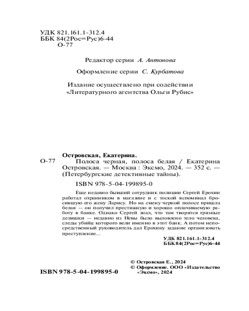 💳 Оплатить за товар можно при получении 🇰🇿 Есть бесплатная доставка по Казахстану 🎁 Копите бонусы с каждой покупки Серия: Петербургские детективные тайны (обложка) Еще недавно бывший сотрудник полиции Сергей Ерохин работал охранником в магазине и с тоской вспоминал бросившую его жену Ларису. Но на смену черной полосе пришла белая — он получил престижную и хорошо оплачиваемую работу в банке. Однако Сергей знал, что там творятся грязные делишки — недавно из Невы было выловлено тело человека, следы убийц которого вели именно в этот банк. А потом непосредственный руководитель дал Ерохину задание организовать преступление.... |