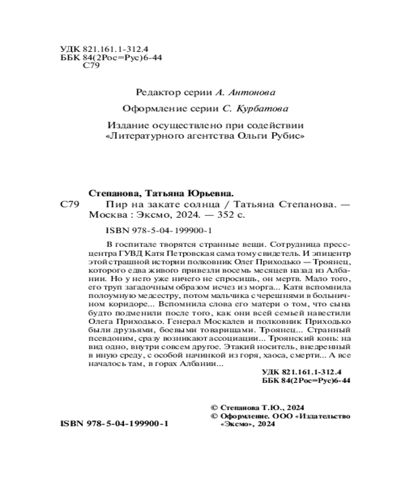 Пир на закате солнцакачество сюжет тон В данный момент этот товар отсутствует в продаже. Возможно, у нас найдется аналогичный или похожий товар здесь. Серия: По следам громких дел. Детективы Т. Степановой. Новое оформление (обложка) В госпитале творятся странные вещи. Сотрудница пресс-центра ГУВД Катя Петровская сама тому свидетель. И эпицентр этой страшной истории полковник Олег Приходько — Троянец, которого едва живого привезли восемь месяцев назад из Албании. Но у него уже ничего не спросишь, он мертв. Мало того, его труп загадочным образом исчез из морга... Катя вспомнила полоумную медсестру, потом мальчика с черешнями в больничном коридоре... Вспомнила слова его матери о том, что сына будто подменили после того, как они всей семьей навестили Олега Приходько. Генерал Москалев и полковник Приходько были друзьями, боевыми товарищами. Троянец... Странный псевдоним, сразу возникают ассоциации... Троянский конь: на вид одно, внутри совсем другое. Этакий носитель, внедренный в иную среду, с особой начинкой из горя, хаоса, смерти... А все началось там, в горах Албании... |