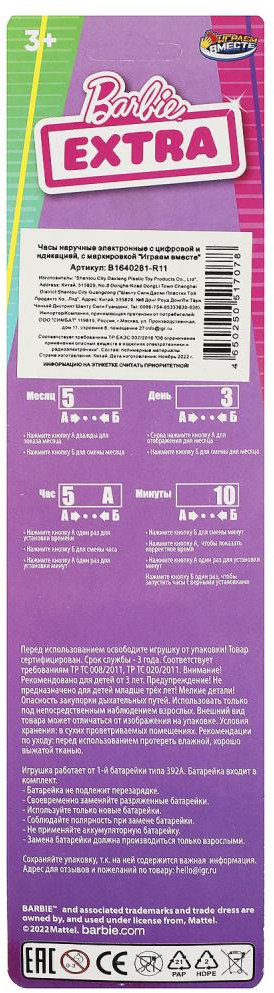 Играем вместе Наручные часы «Барби Extra»В данный момент этот товар отсутствует в продаже. Возможно, у нас найдется аналогичный или похожий товар здесь. Серия: Barbie Электронные часы «Барби Extra» ТМ «Играем вместе» станут прекрасным подарком для вашей принцессы. Часы не только станут прекрасным аксессуаром, дополняющим стильный образ, но и покажут точное время и дату. При этом они очень просты в обращении, и с ними справится даже ребёнок. |
