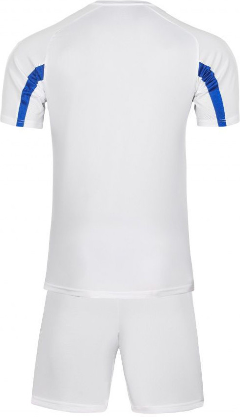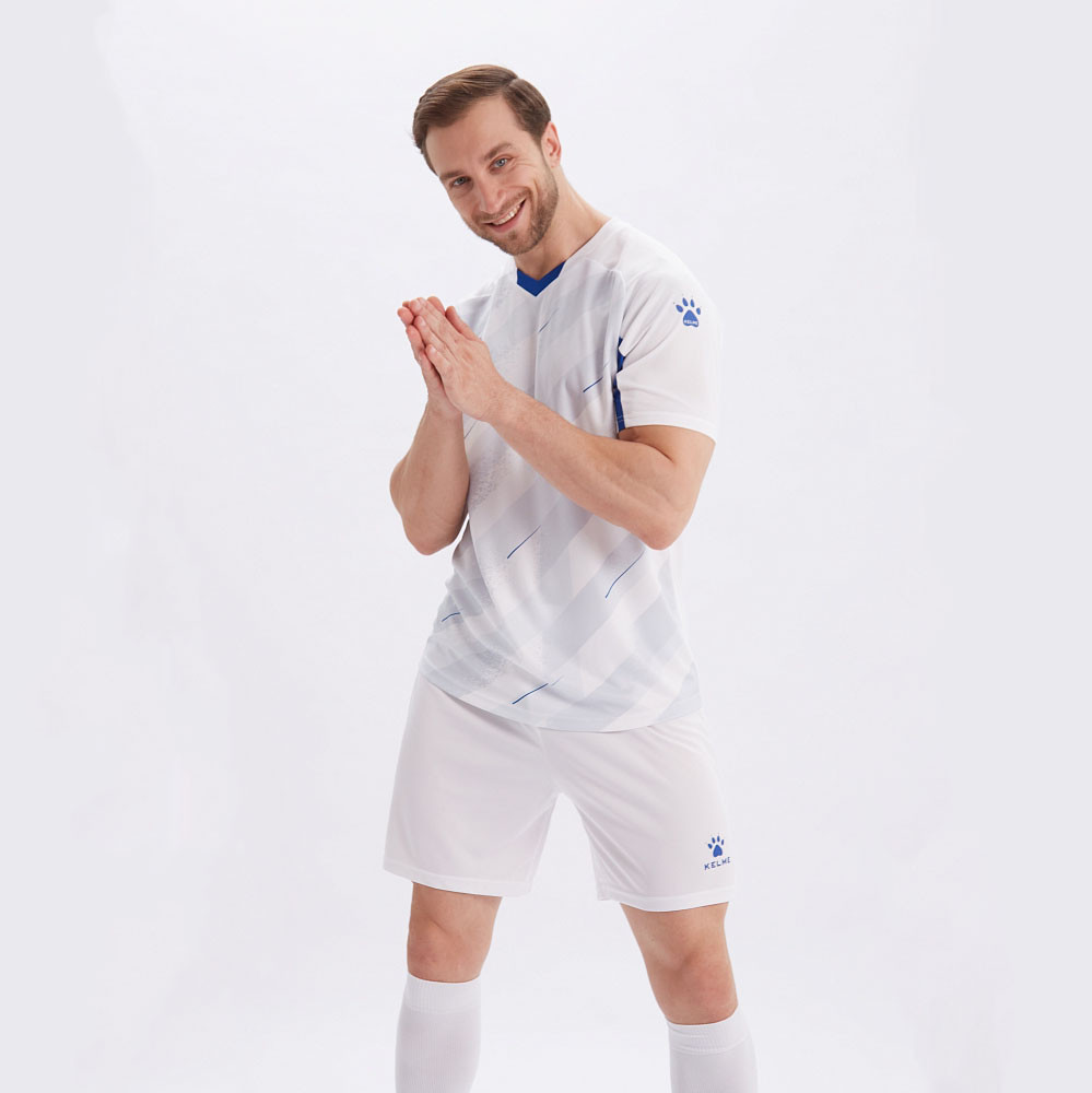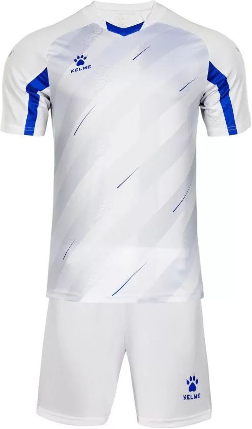 Футбольная форма Kelme состоит из футболки и шорт. Футболка имеет форму рукавов реглан с сетчатыми вставками в подмышечной зоне для дополнительной вентиляции. Футболка выполнена из тонкого, приятного на ощупь и очень прочного полиэстера, который великолепно проветривается и выводит влагу. Удобный V-образный ворот не будет давить в зону яремной ямки и доставлять дискомфорт во время игры. Шорты классического кроя, имеют широкую поясную резинку с шнурком для дополнительной фиксации. Карманы в шортах не предусмотрены. Футбольная форма Kelme — спортивная экипировка, дизайн которой разработан с учетом особенностей техники футбола, футбольной моды, традиций и условий, в которых проходят игры.