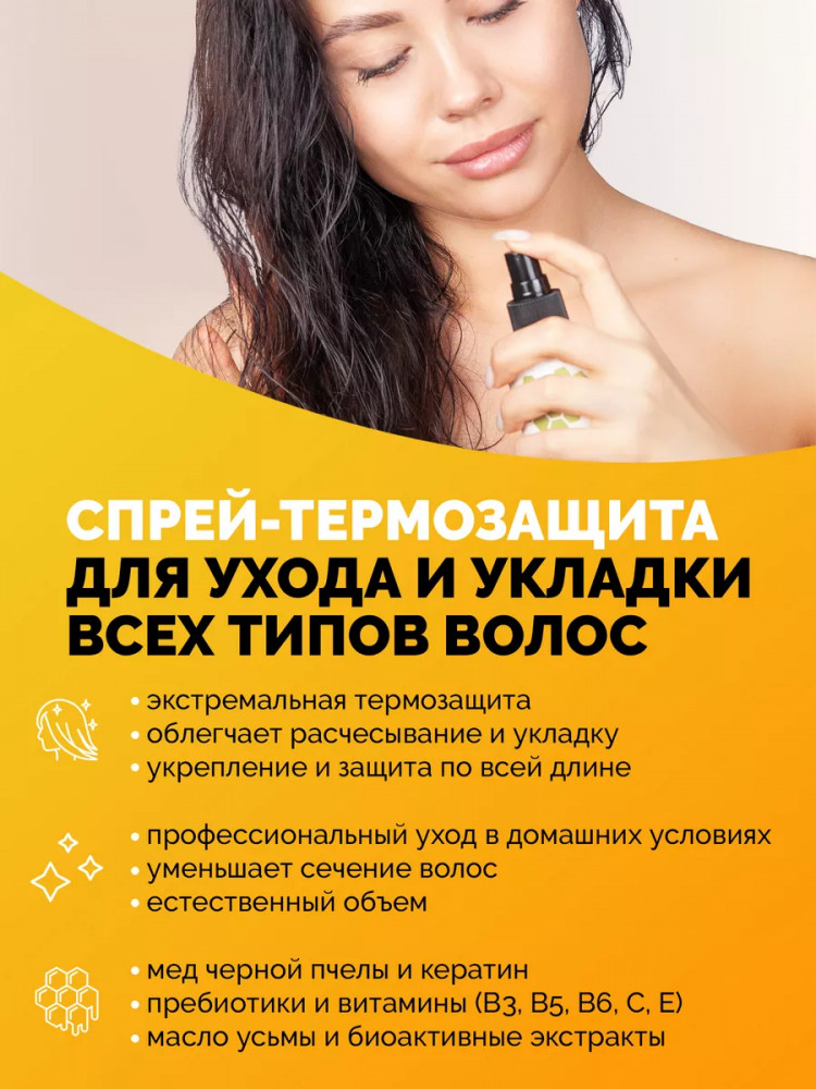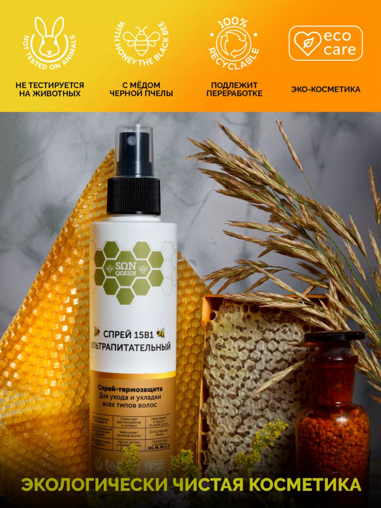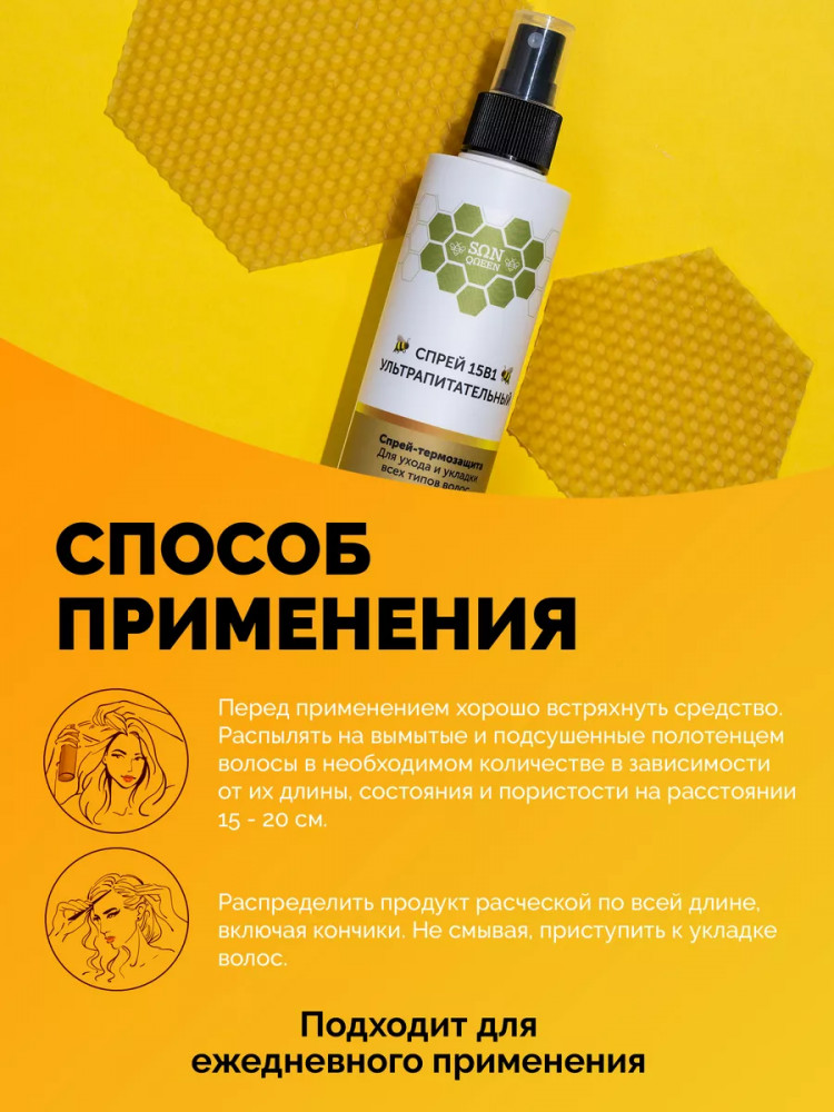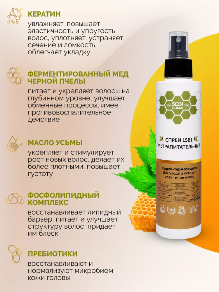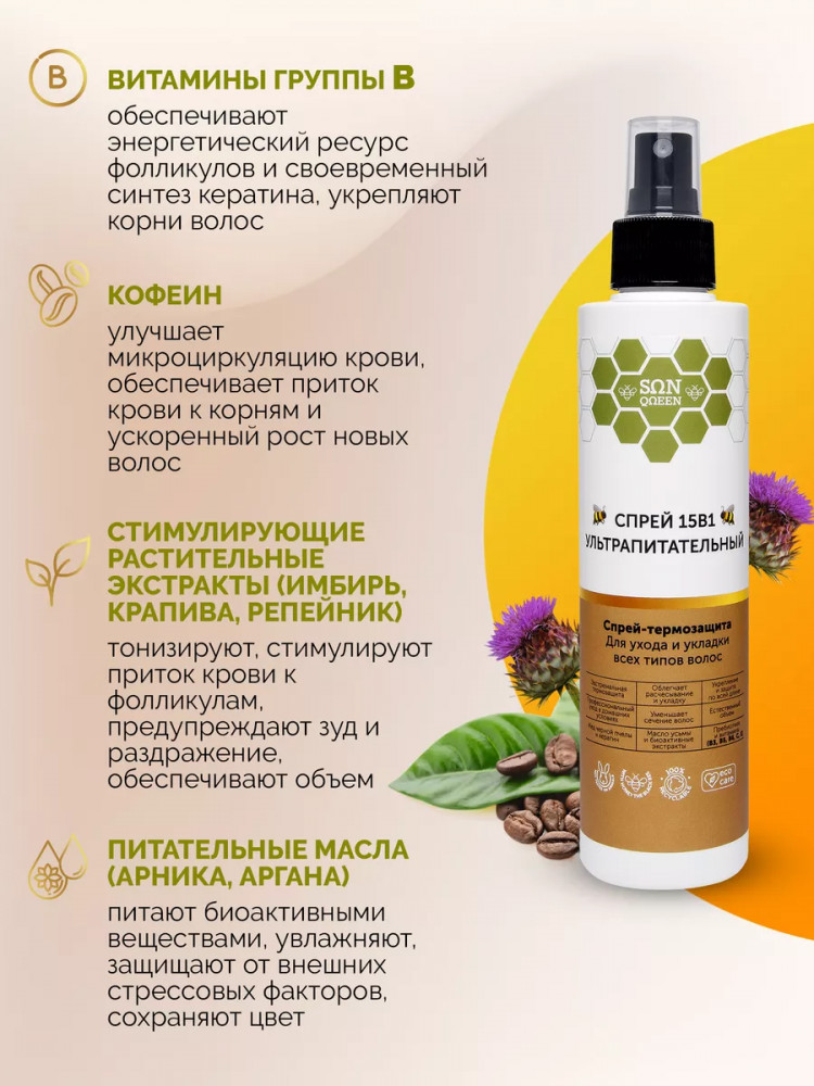 Sunqueen Спрей для волос 15 в 1 «Ультрапитательный»В данный момент этот товар отсутствует в продаже. Возможно, у нас найдется аналогичный или похожий товар здесь. Многофункциональный спрей для всех типов волос 15 в 1. Питательный крем-спрей для ухода и укладки обеспечивает легкое расчесывание, термозащиту волос без утяжеления, жирности и склеивания. Кондиционер термоспрей имеет устойчивый эффект, снижает пушистость, обеспечивает естественный объем, снимает статику, восстанавливает секущиеся кончики, устраняет ломкость и пористость. Натуральный состав обеспечивает максимальное увлажнение, обогащает питательными компонентами и витаминами, придает блеск по всей длине. Заменяет целый ряд средств для ухода и укладки, содержит витамины от выпадения волос. После применения укладка делается быстро и легко. Несмываемый крем спрей уменьшает сечение, разглаживает поврежденную структуру, защищает от негативного влияния окружающей среды, цвет окрашенных прядей будет держаться дольше. После применения локоны мгновенно получают необходимое увлажнение, питание и уход, выглядят сильными здоровыми и ухоженными. |