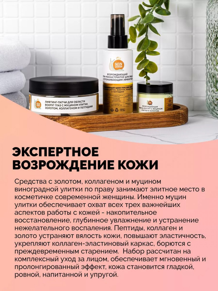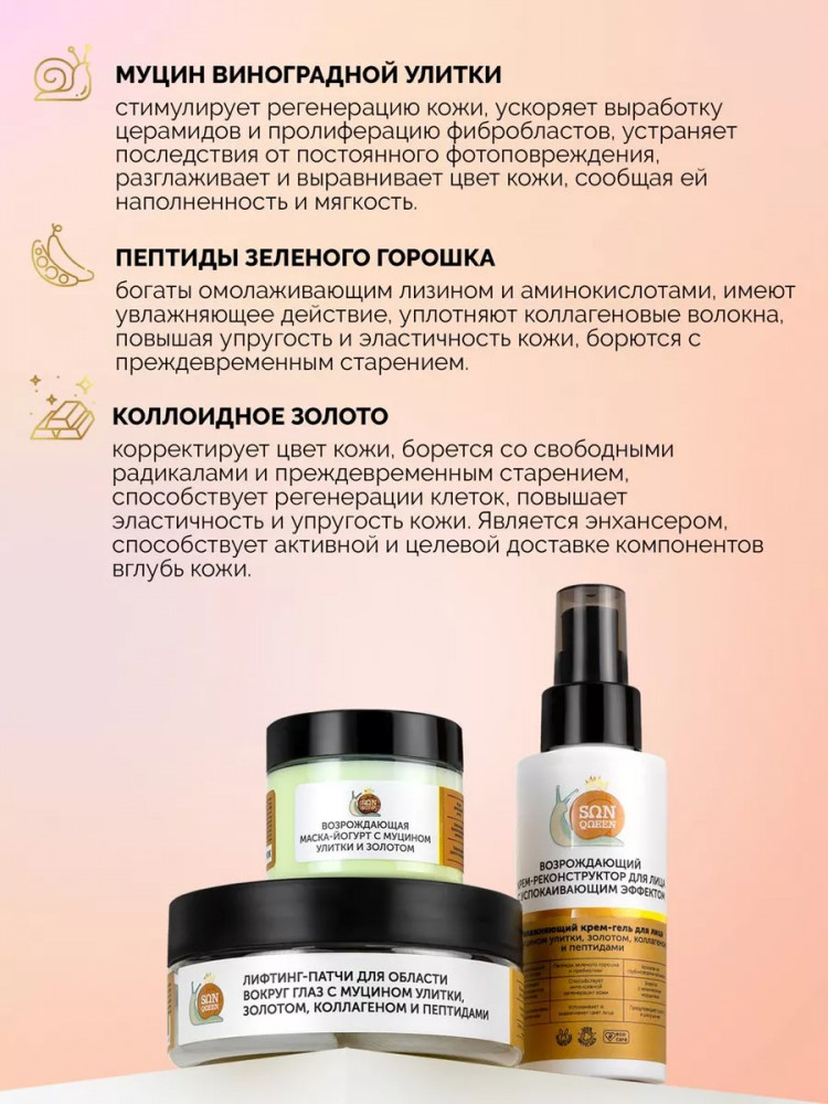 Sunqueen Набор для ухода за лицом с муцином улиткиВ данный момент этот товар отсутствует в продаже. Возможно, у нас найдется аналогичный или похожий товар здесь. Набор профессиональной косметики для кожи лица эффективно борется с преждевременными признаками старения. В набор входят патчи с лифтинг эффектом для области вокруг глаз, регенерирующий крем для лица с муцином улитки и восстанавливающая маска для лица. Данный косметический набор упакован в красивую аккуратную коробку из экологичных материалов и отлично подойдет в качестве подарка и сюрприза. Патчи можно использовать не только для области вокруг глаз, но и для лба, губ и носогубного треугольника. Они выполнены из нетканого материала, впитывают в себя, а затем переносят на кожу лица активные компоненты сыворотки. Лифтинг крем с коллагеном устраняет вялость кожи, разглаживает и выравнивает цвет лица, снижает образование мимических морщин. Увлажняет, укрепляет каркас кожи, поддерживает гидро-липидный баланс, имеет омолаживающий эффект, может применятся как возрастная косметика. Пантенол стимулирует регенерацию кожи, успокаивает ее, сокращает раздражение, покраснение, уменьшает зуд, снижает трансэпидермальную потерю влаги. Содержит только экологически чистые компоненты. Увлажняющая омолаживающая маска для лица с йогуртом разглаживает, выравнивает и корректирует цвет кожи. Придает коже мягкость, борется с шелушением и сухостью. |