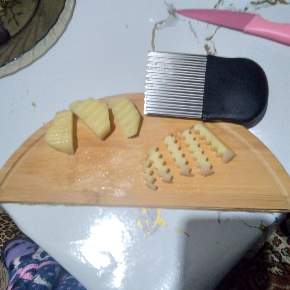 достаточно острое.легко разрезает все овощи и фрукты.прочная пластика держалка.красивые волнистые формы получаются