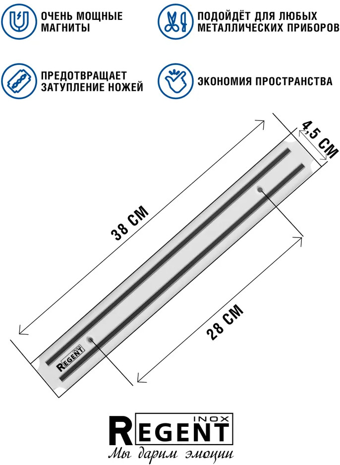 💳 Оплатить за товар можно при получении 🇰🇿 Есть бесплатная доставка по Казахстану от 1 дня 🎁 Копите бонусы с каждой покупки Серия: Forte Удобная настенная магнитная планка для ножей Regent Inox произведена из пластика и нержавеющей стали, которые не вступает в реакцию с другими изделиями. Изделие отличается стильным современным дизайном, функциональностью и удобством. Магнитный держатель предназначен для фиксации ножей и других металлических кухонных аксессуаров в наиболее удобном месте рабочего кухонного пространства. |
