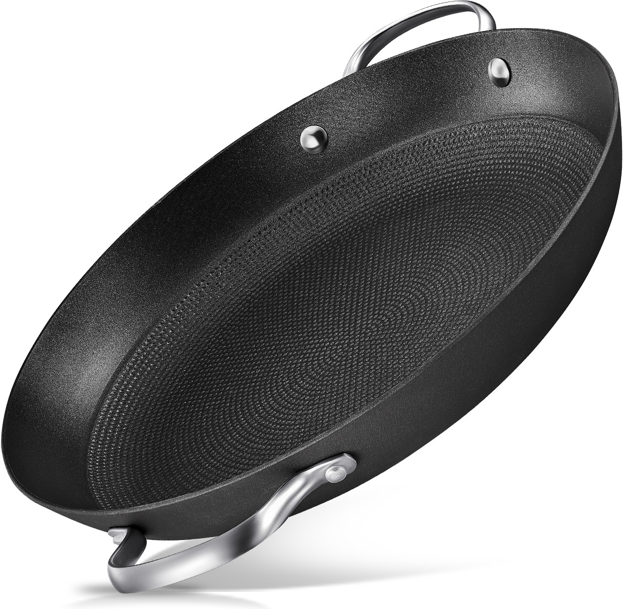 Структура рифленого дна в виде сот позволяет использовать меньше масла и жира , препятствует растеканию, равномерно распределяет его по поверхности. Безопасное многослойное антипригарное покрытие. долгий срок службы.