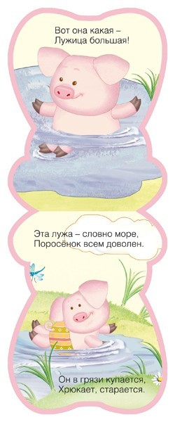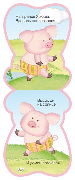 Немного неудобно в плане вертикального открывания книжечки. Картинки интересные, но совсем не яркие. Стишок про Хрюшу веселый, легко запоминается. В принципе довольна.