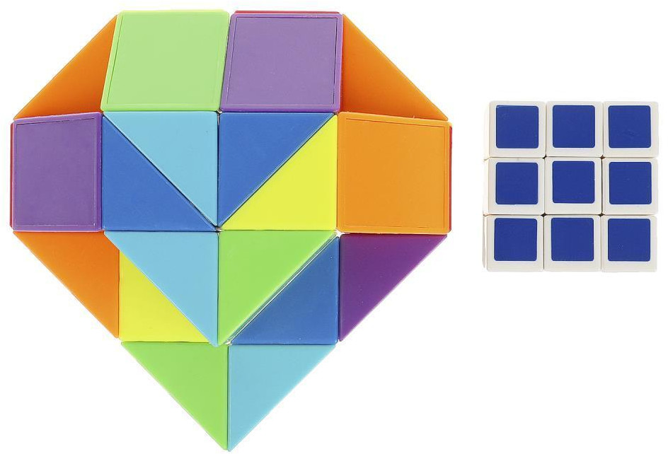 Эта занимательная головоломка собирается по принципу «кубика Рубика» и отлично тренирует логику и мышление. А собранная в результате многочисленных манипуляций с кубиком фигура принесёт юному любознайке много радости, и он будет гордиться тем, что у него получилось решить эту головоломку. Также с ней можно играть как со змейкой и составлять различные фигуры.