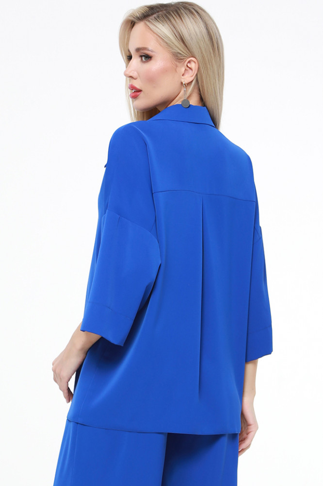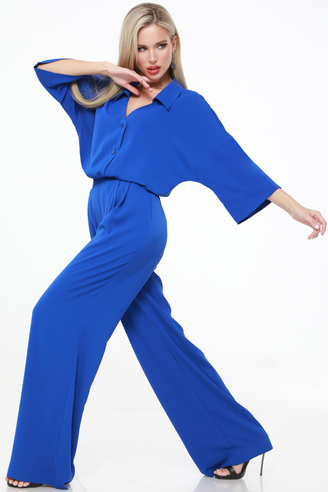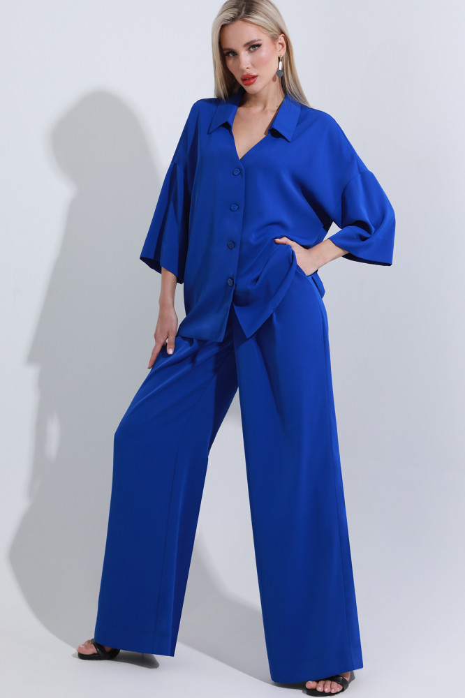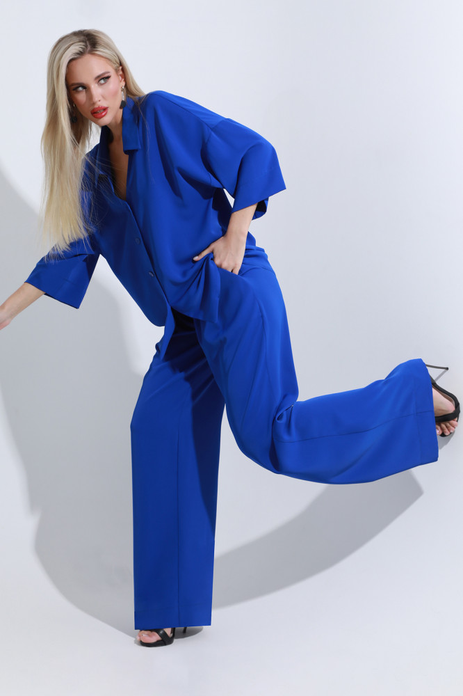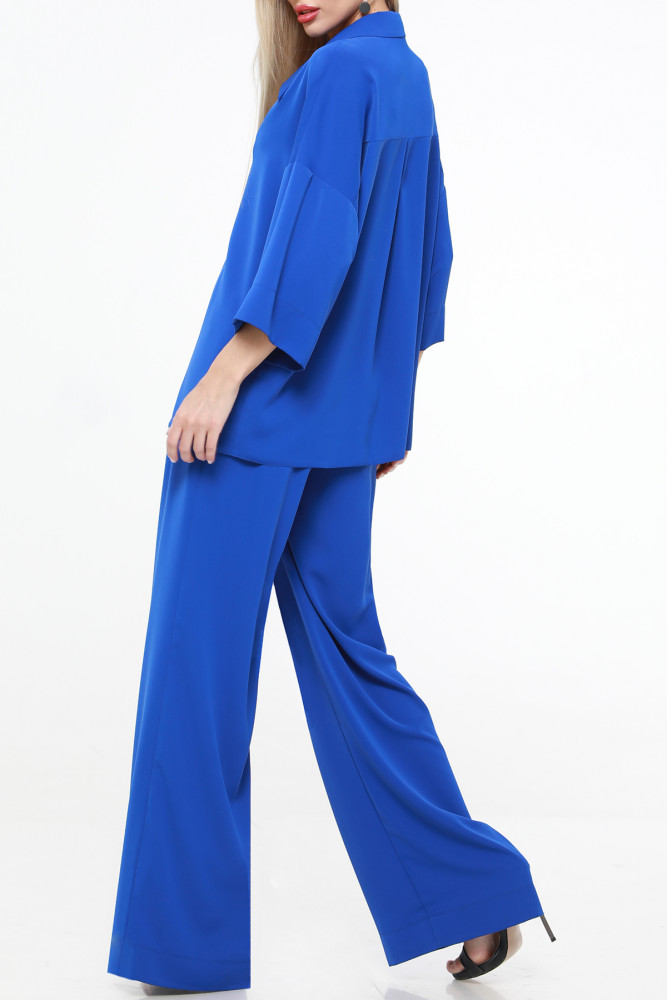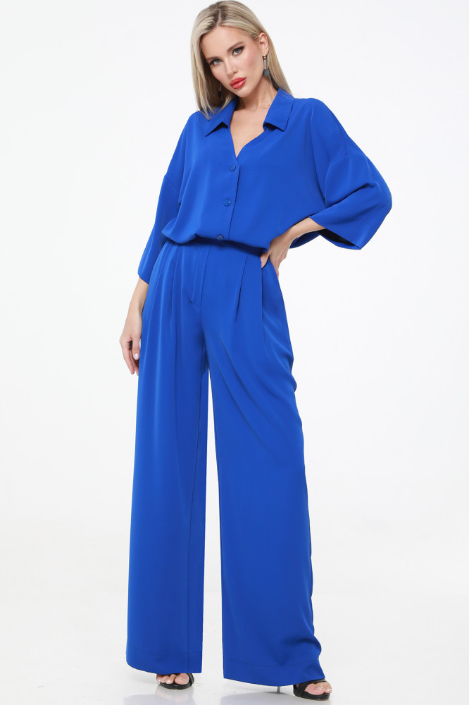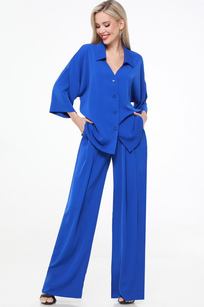 Элегантный и универсальный костюм для любых событий. Блузка с рубашечным воротником и фигурным вырезом горловины придаёт изысканность, а цельнокроеный укороченный рукав создаёт ощущение лёгкости. Брюки прямого кроя с резинкой на спинке и защипами спереди обеспечивают комфорт и элегантность. Костюм легко адаптируется под разные ситуации: для деловых встреч можно дополнить его туфлями-лодочками и небольшой сумкой для строгого и профессионального образа.